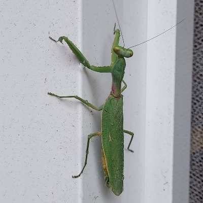 ![]() 上面照片:陳維琪拍攝 (綠色型) 螳螂科 〉斧螳屬 〉寬腹斧螳(Hierodula patellifera、雙突斧螳、廣斧螳、蘇氏斧螳) (原生種;台灣物種名錄標名寬腹斧螳,別名雙突斧螳、廣斧螳、蘇氏斧螳;體長約5~7公分;體色綠色或褐色;腹部寬大;翅背兩側各有一枚白色斑點) |