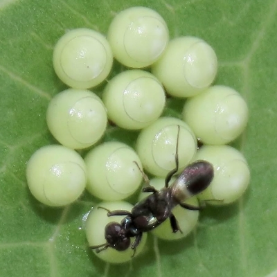 ![]() 上面照片:小花老師拍攝 (每次產卵12粒,在平坦的地方通常會排成圓形;平腹小蜂正在寄生,將卵產於蝽象的卵中) 蝽科 〉黑蝽屬 〉黃斑黑蝽(Erthesina fullo、黃霜蝽、麻皮蝽、麻椿象、黃斑蝽、麻紋蝽) (原生種;台灣物種名錄標名黃斑黑蝽,別名黃霜蝽、麻皮蝽、麻椿象、黃斑蝽、麻紋蝽,附有照片;成蟲體長約2公分;每次產卵12顆) |