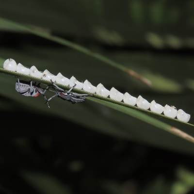 ![]() 上面照片:小花老師拍攝 (產卵) 緣蝽科 〉Plinachtus 屬 〉鈍肩普緣椿象(Plinachtus bicoloripes) (原生種;台灣物種名錄的科名使用蝽字,種名則使用椿字;成蟲體長約1公分) |