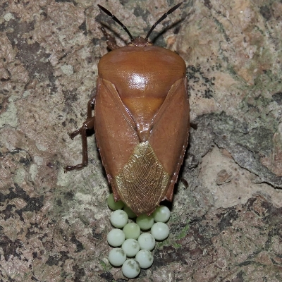 ![]() 上面照片:林美燕拍攝 (雌蟲護卵,體色變淡) 盾背蝽科 〉角盾蝽屬 〉角盾蝽(Cantao ocellatus、黃盾背椿象、黃斑角盾椿) (原生種;台灣物種名錄標名角盾蝽,科名和屬名使用蝽字,種名則使用椿字,附有照片;體長約2公分多;體色變異多, 橙色至白色;雌蟲在產卵及護卵期間體背斑紋會漸漸褪色變淡) |