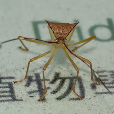 ![]() 上面照片:陳維琪拍攝 (終齡若蟲) 盾背蝽科 〉角盾蝽屬 〉角盾蝽(Cantao ocellatus、黃盾背椿象、黃斑角盾椿) (原生種;台灣物種名錄標名角盾蝽,科名和屬名使用蝽字,種名則使用椿字,附有照片;體長約2公分多;體色變異多, 橙色至白色;雌蟲在產卵及護卵期間體背斑紋會漸漸褪色變淡) |