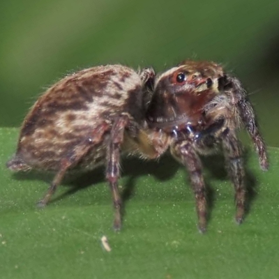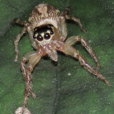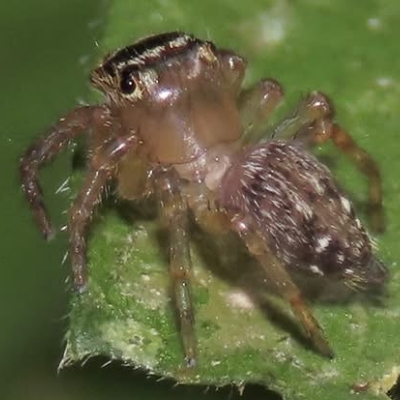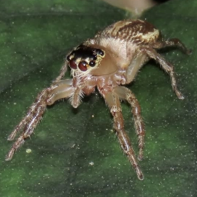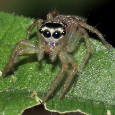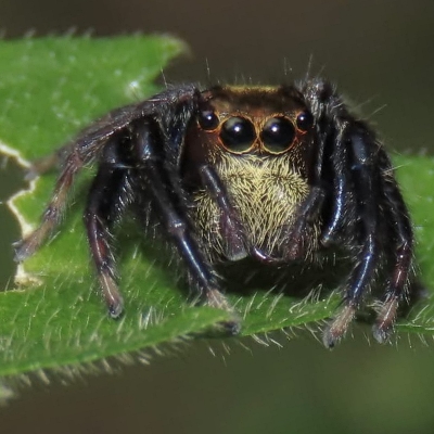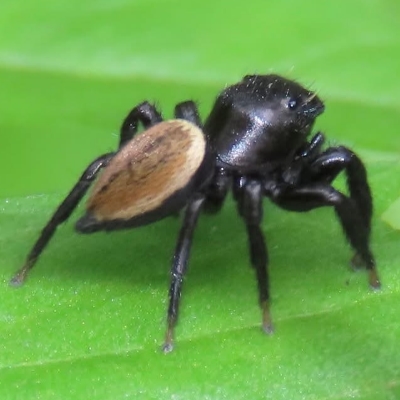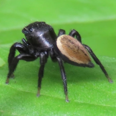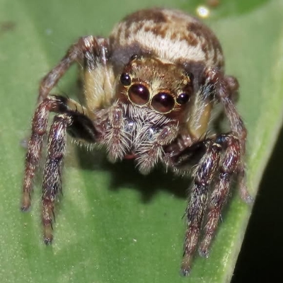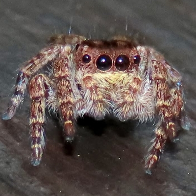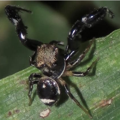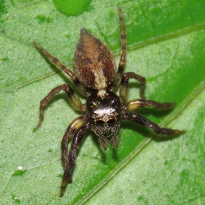 ![]() 上面照片:陳維琪拍攝 (雄蛛) 蠅虎科 〉褐條斑蠅虎(Plexippus paykulli、黑色蠅虎、茶色條斑蠅虎) (原生種;台灣物種名錄附有照片;頭胸部中央有一條白色條紋,近腹部末端兩側有白色小斑點) |