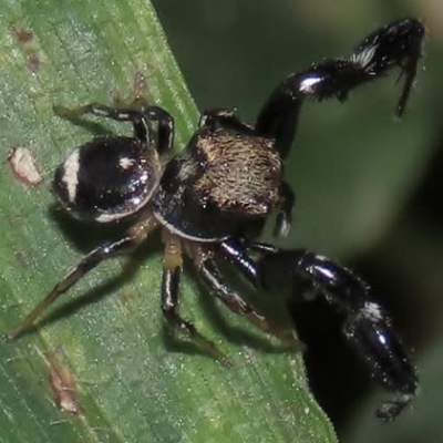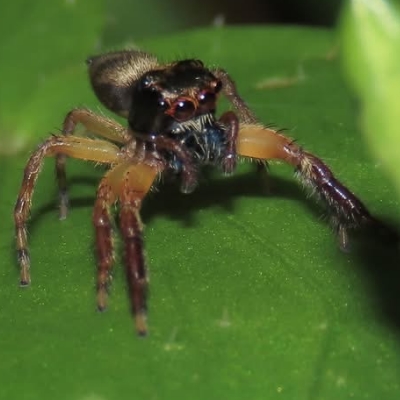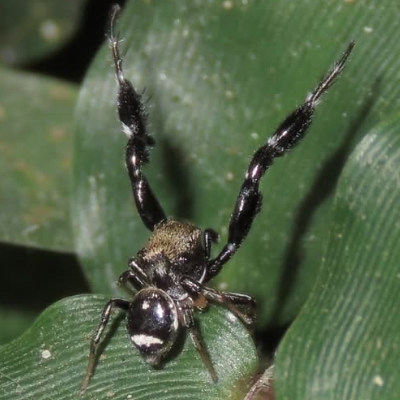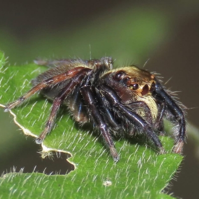 ![]() 上面照片: 小花老師拍攝於新竹飛鳳山 蠅虎科 〉蛤蟆蛛屬 〉鰓蛤蟆蛛(Harmochirus brachiatus) (原生種;體長短於0.5公分;第一步足非常粗大,黑褐色) |