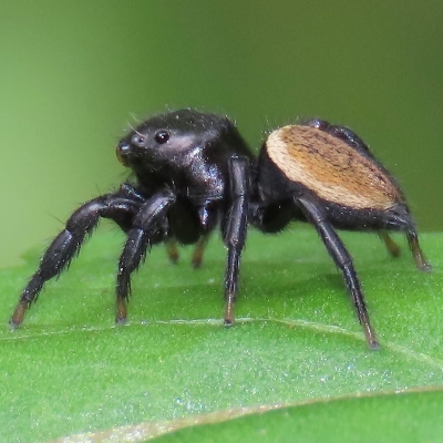 ![]() 上面照片:蟹老闆拍攝於新北市安和國小 (雄蛛) 蠅虎科 〉遜蠅虎屬 〉安德遜蠅虎(Hasarius adansoni) (原生種;台灣物種名錄附有照片;雄蛛,胸後及腹前有白色月形斑紋,近腹部末端兩側有白色小斑點) |