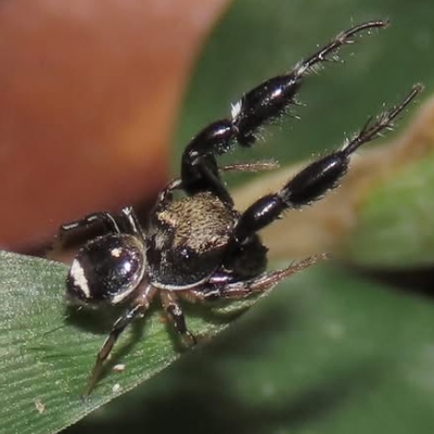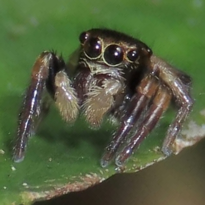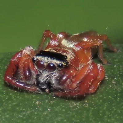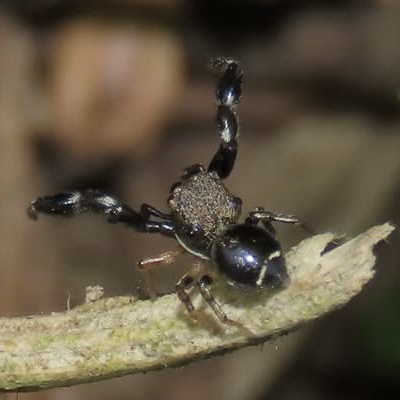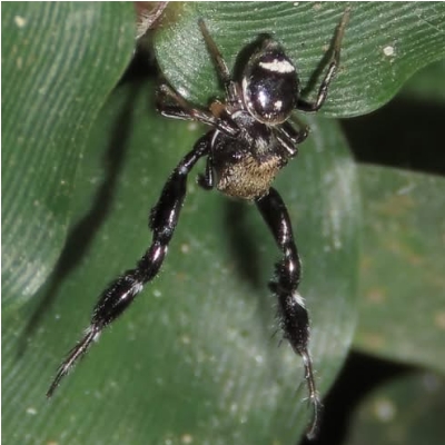 ![]() 上面照片: 小花老師拍攝於汐止大尖山 蠅虎科 〉蛤蟆蛛屬 〉鰓蛤蟆蛛(Harmochirus brachiatus) (原生種;體長短於0.5公分;第一步足非常粗大,黑褐色) |