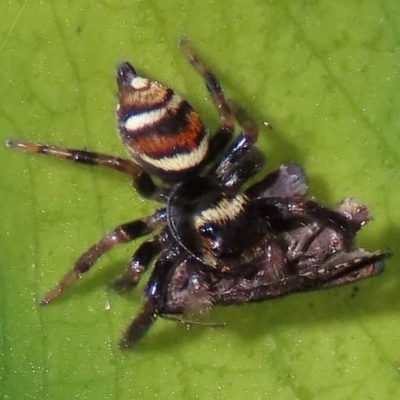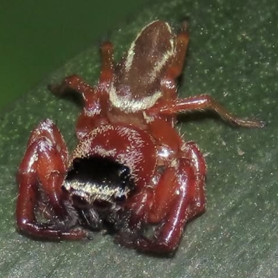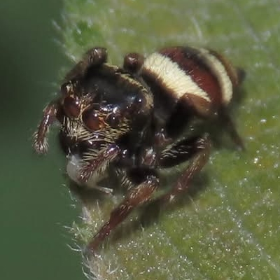 ![]() 上面照片:小花老師拍攝 (雌蛛) 蠅虎科 〉兜蠅虎屬 〉毛垛兜蠅虎(Ptocasius strupifer、毛垛兜蠅虎) (原生種;台灣物種名錄標名毛垛兜蠅虎,附有照片 ;雌蛛腹背黑褐色有2條白色的橫帶,腹端白色) |