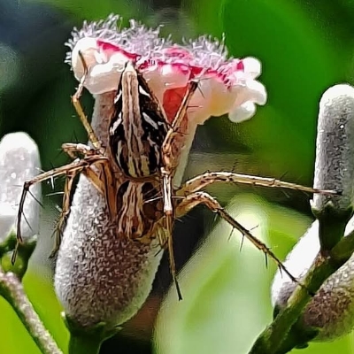![]() 上面照片:小花老師拍攝 (雌蛛) 貓蛛科 〉貓蛛屬 〉斜紋貓蛛(Oxyopes sertatus) (原生種;腹側有斜向的斑紋) |