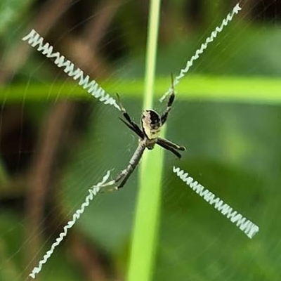![]() 上面照片:蟹老闆拍攝於陽明山二子坪 金蛛科 〉金蛛屬 〉眼點金蛛(Argiope ocula、目金蛛) (原生種;台灣物種名錄標名眼點金蛛,別名目金蛛,附有照片;雌蛛體長約2~3公分;腹部背上有2個像眼睛的斑點) |