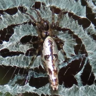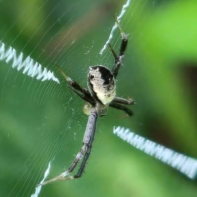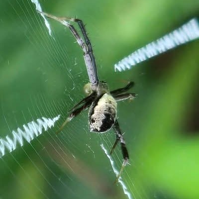 ![]() 上面照片:小花老師拍攝 金蛛科 〉塵蛛屬 〉長銀塵蛛(Cyclosa ginnaga) (原生種;台灣物種名錄標名長銀塵蛛,別名長腹銀色塵蛛、長腹艾蛛) |