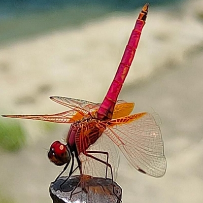 ![]() 上面照片:陳玉琴拍攝 (雄) 蜻蜓科 〉褐蜻屬 〉紫紅蜻蜓(Trithemis aurora) (原生種;維基百科標示褐蜻屬;體長約3.5公分;雄蟲複眼紅色,全身以紫紅色為主;雌蟲橙褐色) |