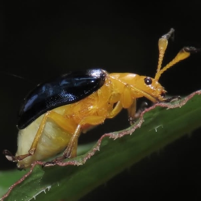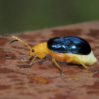 ![]() 上面照片:鄭演義拍攝 金花蟲科 〉長腳螢金花蟲屬 〉黑緣長腳螢金花蟲(Monolepta kuroheri ) (台灣特有種;體長約0.5公分;翅緣黑色) |