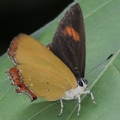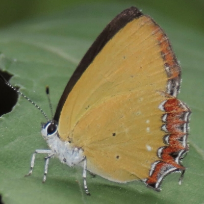 ![]() 上面照片:張儷蓁拍攝 (雌蝶) 灰蝶科 〉日灰蝶屬 〉紫日灰蝶(Heliophorus ila matsumurae、濃紫彩灰蝶、紅邊黃小灰蝶、紅緣小灰蝶、深紫彩灰蝶、濃紫黃灰蝶) (原生種;亞種;台灣物種名錄標名紫日灰蝶,別名濃紫彩灰蝶、紅邊黃小灰蝶、紅緣小灰蝶、深紫彩灰蝶、濃紫黃灰蝶,附有照片;展翅約3公分多;雌蝶前翅有橙黃色的斜斑;雄蝶前翅近基部有藍紫色的斑塊) |