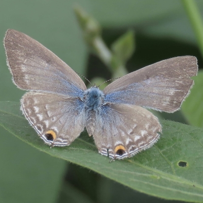 ![]() 上面照片:張儷蓁拍攝 灰蝶科 〉豆波灰蝶屬 〉豆波灰蝶(Lampides boeticus、波紋小灰蝶、波紋灰蝶、曲斑灰蝶、亮灰蝶、豆莢灰蝶) (原生種;台灣物種名錄標名豆波灰蝶,附有照片;翅基藍紫色;後翅下面有一條灰白色縱帶) |