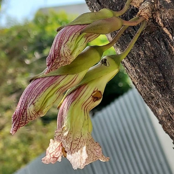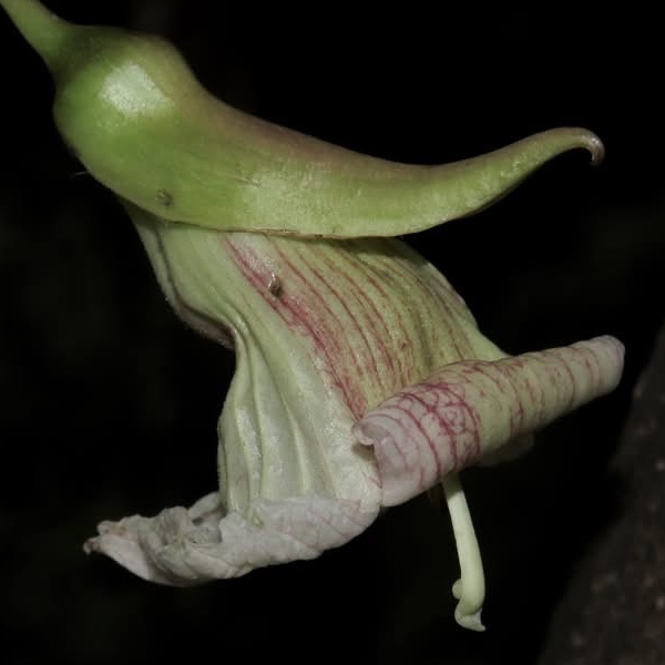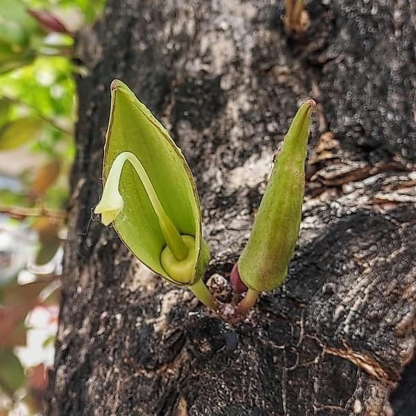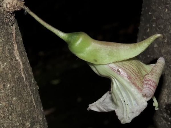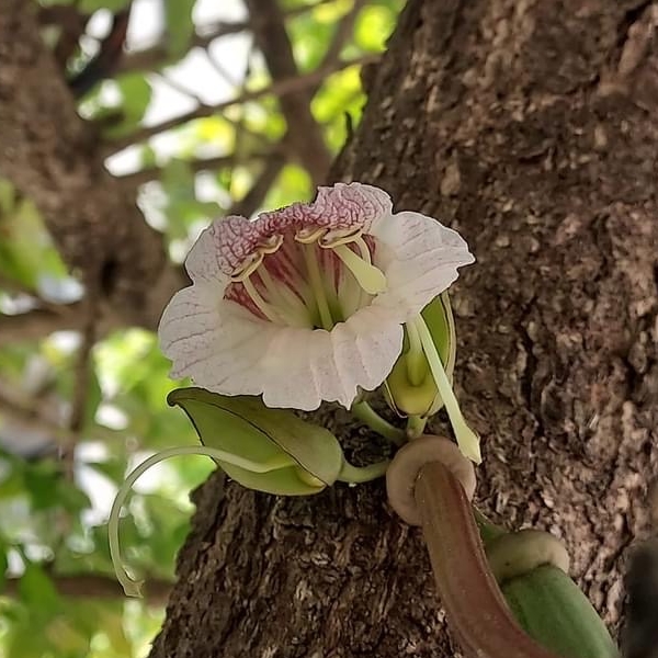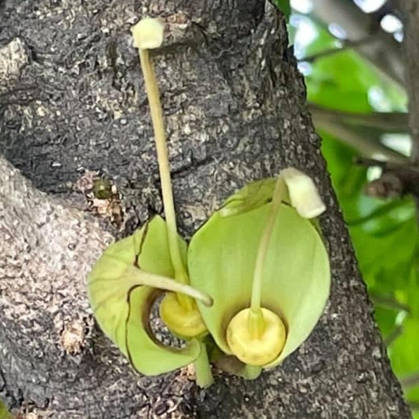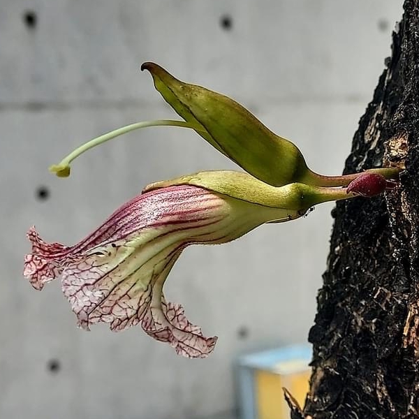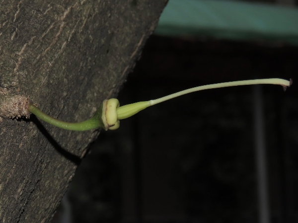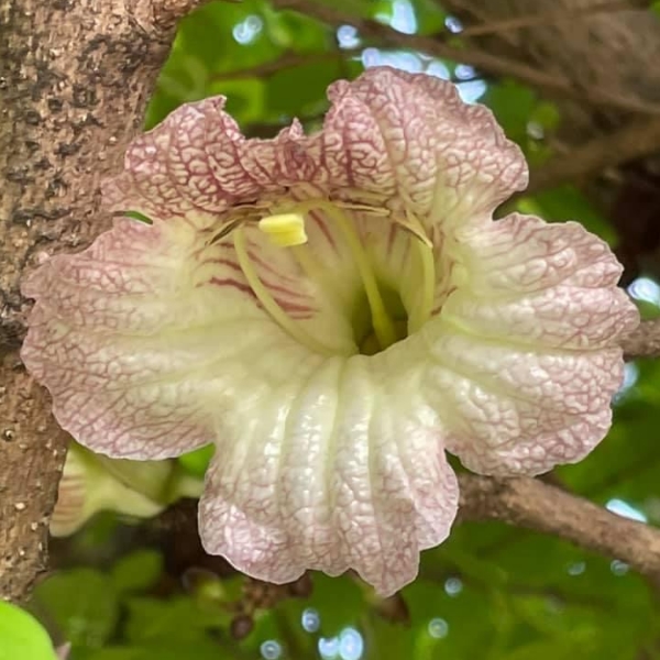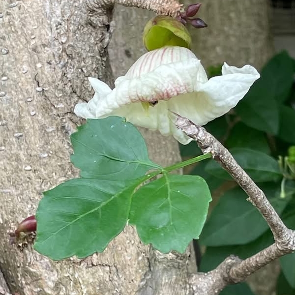 (栽培種;原生於中美洲的巴拿馬;台灣物種名錄標名蠟燭木;小喬木;三出複葉,橢圓形至倒卵形,全緣或淺缺刻,葉柄具翼;幹生花,單生或2~4朵叢生;花冠白色,帶有紫色;花萼1枚,側裂,長卵形;果實長條形,長度可達30~50公分)