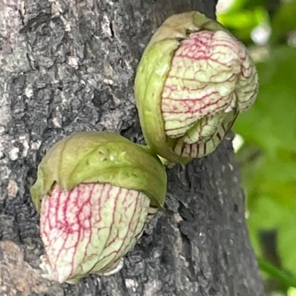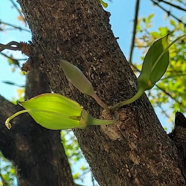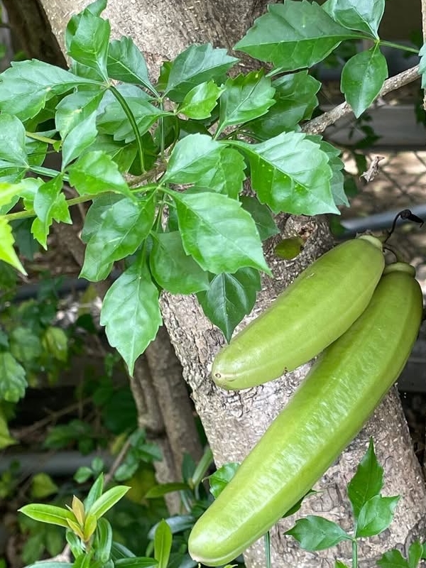 ![]() 上面照片:張儷蓁拍攝 (果實比較短胖,可能是食用蠟燭木(Parmentiera aculeata、Parmentiera edulis、蠟瓜樹)) |