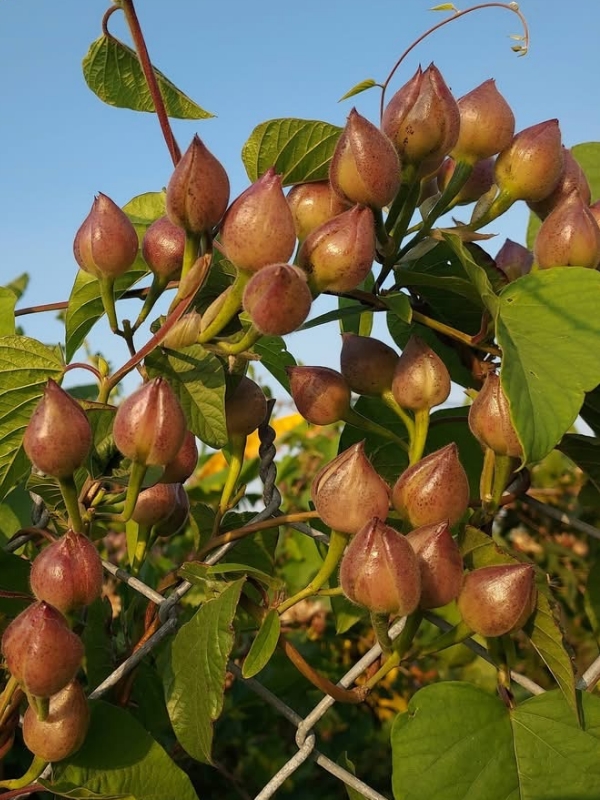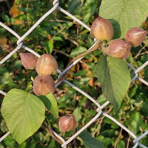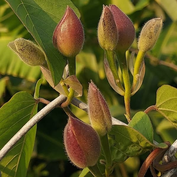 ![]() 上面照片:陳維琪拍攝 (花萼宿存,包覆蒴果,外觀呈桃形;蒴果扁球形,由4個氣囊組成(每個氣囊內具種子1枚),氣囊能幫助種子藉由水力或風力傳播;蒴果狀似餅盒,故名盒果藤) |
