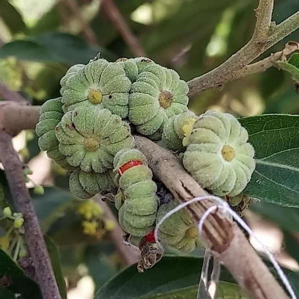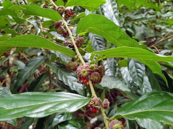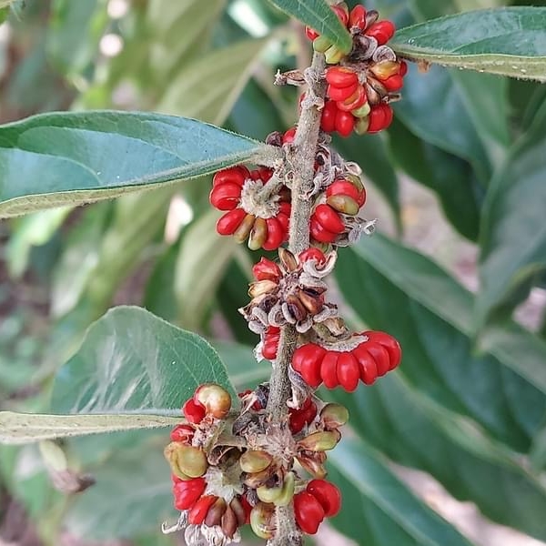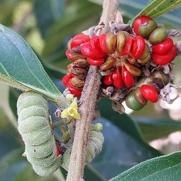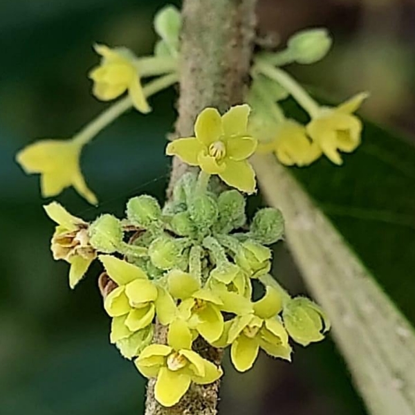(原生種;原生於台灣至澳洲一帶;喬木;全株被毛;枝條細長;單葉互生,長橢圓形,兩列狀;花序不具總梗,簇生葉腋;雌雄異花,不具花瓣;雄花花梗較長,花被片6枚,2輪,平展,黃色;雌花花梗較短,花萼卵形外張,柱頭杯狀,外伸;蒴果扁球形,12~15瓣,密被白色短毛,柱頭宿存;成熟瓣裂,種子紅色)