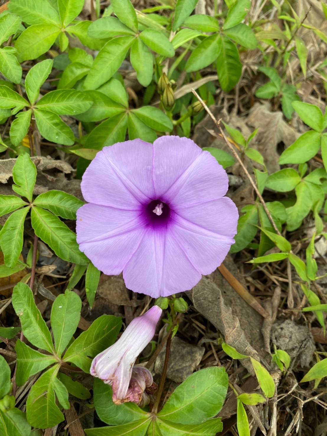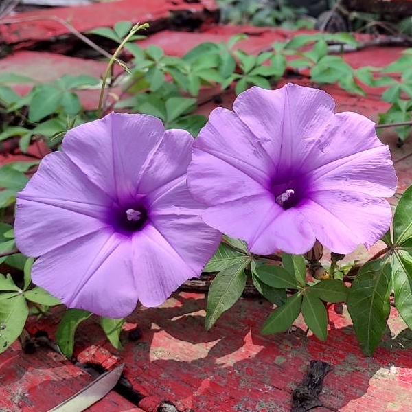 (原生種或歸化種;世界植物在線 POWO 標示原生於台灣、中國大陸至非洲一帶;台灣物種名錄標名番仔藤(意味為外來歸化植物),別名槭葉牽牛、五爪金龍、五爪龍、碗公花、白首烏、掌葉牽牛,附有照片,標示為歸花種;維基百科和香港柴娃娃植物網皆標名五爪金龍;台灣普遍稱作槭葉牽牛;多年生纏繞性草本;莖右旋;掌狀複葉,互生;小葉5枚(後小葉或分叉狀);花朵單生葉腋或3朵成聚繖花序;花冠漏斗、5淺裂至5深裂,淡紫色(偶有白色);蒴果近球形,4瓣裂,種子黑色)