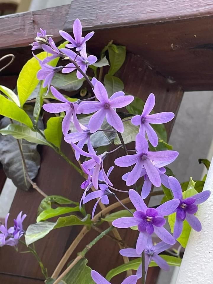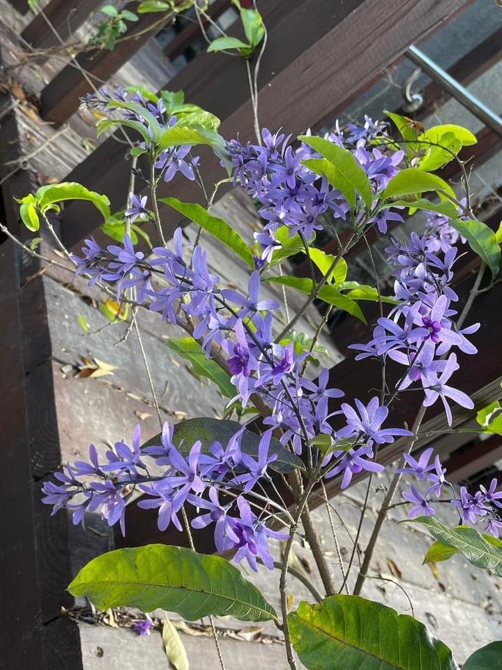 (栽培種;原生於中美洲以及南美洲的北半部一帶;維基百科標名藍花藤,附有照片(相符),標示紫霞藤屬;台灣物種名錄20260314標名錫葉藤(原生於美洲,卻是東南亞傳統打磨錫器的錫葉藤?),標示藍花藤屬;半蔓性灌木;全株被毛;新生枝條具有纏繞能力,可攀附其他植物或棚架;單葉對生,橢圓形,表面密被粗毛,觸感十分粗糙;總狀花序,頂生,下垂狀;花萼5枚,淺紫色,形似花瓣;花瓣5枚,倒卵形,紫色,較小;種子具宿存花萼,可助風力傳播;藍花藤有別名錫葉藤(可能誤用),容易與不同科的錫葉藤混淆,不宜使用)