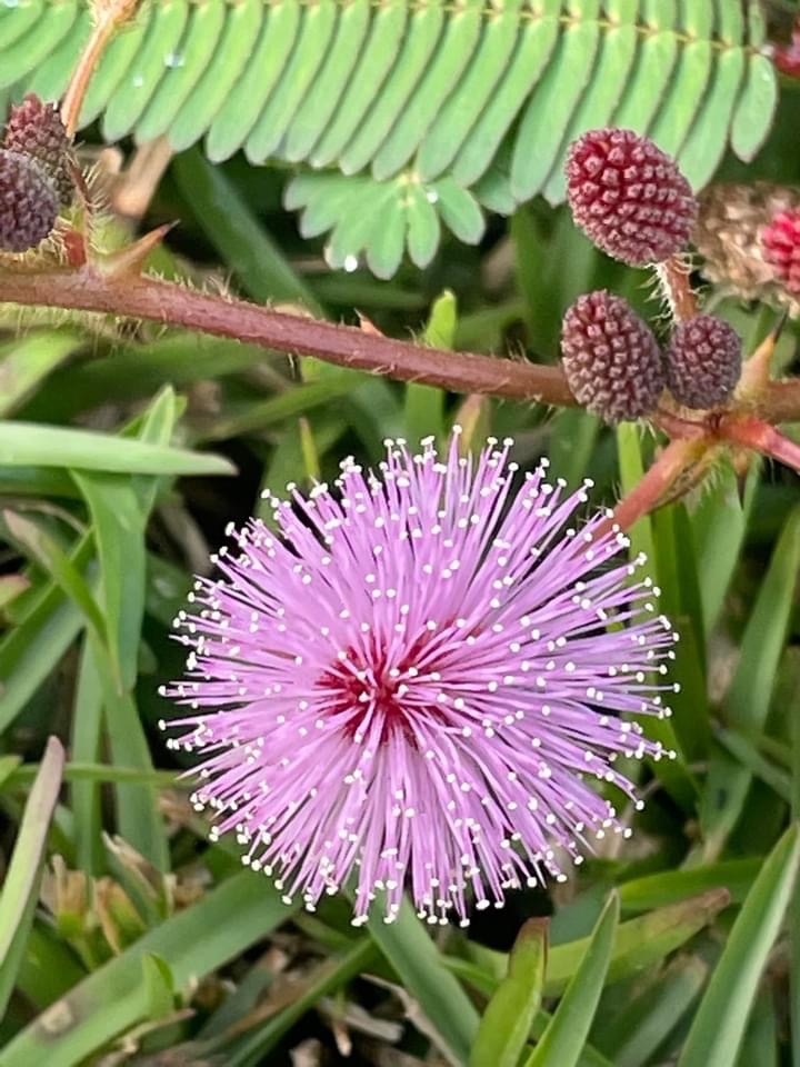 (歸化種;原產於美洲熱帶地區;多年生草本;枝條疏被倒刺及反曲剛毛;二回羽狀複葉(幼苗一回羽狀複葉,小葉6枚),互生;小羽葉1~2對;小葉可達20對(或更多),長橢圓形至鐮形,葉緣具纖毛,常帶紫色;葉片對觸摸敏感會閉合下垂;頭狀花序(煙火狀),腋生,具長梗;每朵小花雄蕊4枚。花絲細長,粉紅色,末端花藥白色;莢果3~4節,側緣具刺,成熟逐節掉落(側緣鉤刺仍留在果序上))