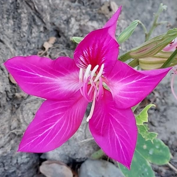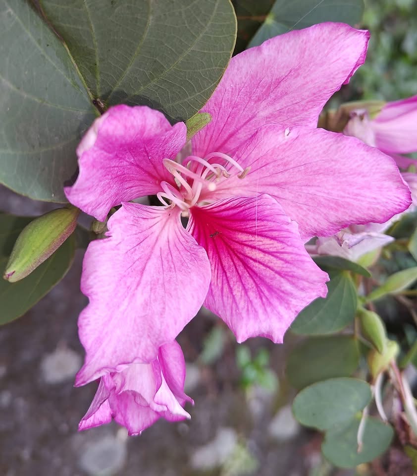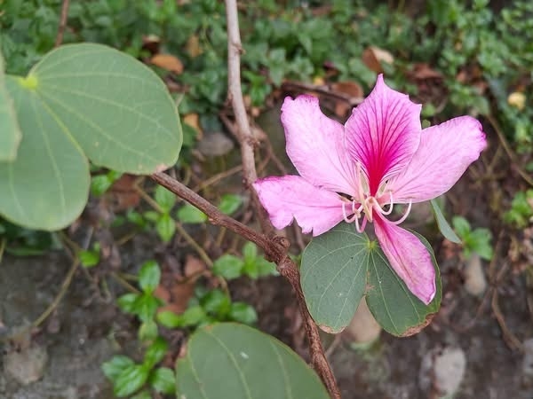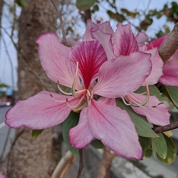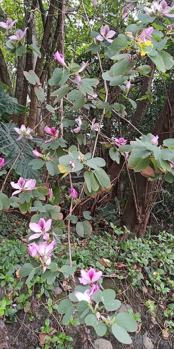 (歸化種;原生於中國大陸、中南半島和印度半島;台灣物種名錄標名羊蹄甲,別名白花羊蹄甲;落葉小喬木;單葉互生,羊蹄形;花冠深粉紅色;雄蕊通常5枚;春天開花,頂生或腋生;花瓣5枚,粉紅色至紫色;雄蕊5枚;開花時,幾乎無葉;莢果,扁平,長約20~30公分)