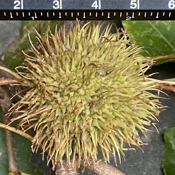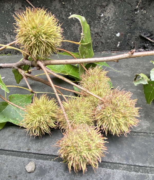 (原生種;維基百科標名楓香樹,別名台灣香膠樹;中、大落葉喬木;樹皮灰褐色,有縱向裂紋;單葉互生,掌狀3裂或5裂,5裂多見於幼葉,鋸齒緣;秋冬季葉片有楓紅現象;雌雄同株異序,無花瓣;雄花黃色,短穗狀花序排列成總狀花序;雌花紅色,頭狀花序,具細長的總花梗,花後花柱伸長成刺狀;聚合果,刺球狀,成熟由綠轉深褐色,徑約2.5至3公分;種子2型,完全種子具狹翅,長約0.7公分,不完全種子呈不規則稜角;楓香因葉片似楓,樹脂具芳香而得名)