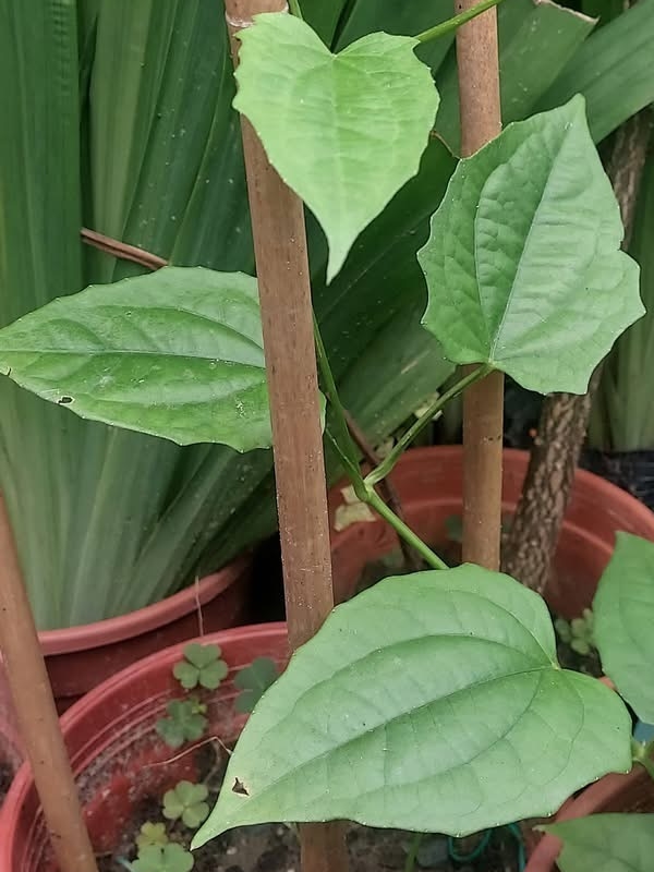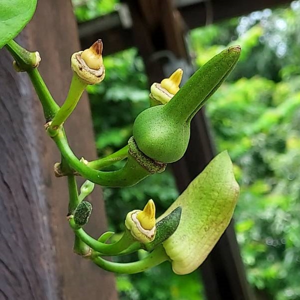 (歸化種;原生於中南半島;台灣物種名錄標名樟葉鄧伯花,別名月桂藤;纏繞性木質藤本;地下有發達走莖;莖條右旋;單葉對生,卵形至長卵形,或淺裂齒狀,三出脈;總狀花序,腋生或頂生,懸垂狀;花瓣5枚,淺藍紫色;蒴果先端長喙狀)
