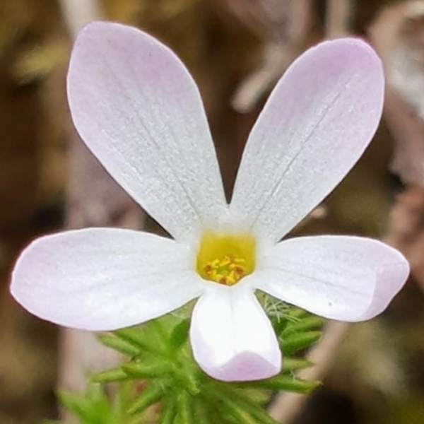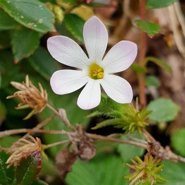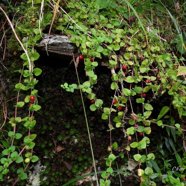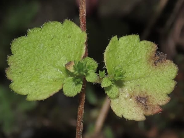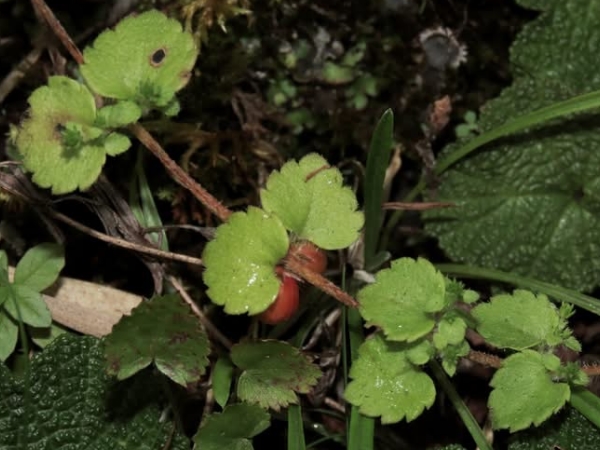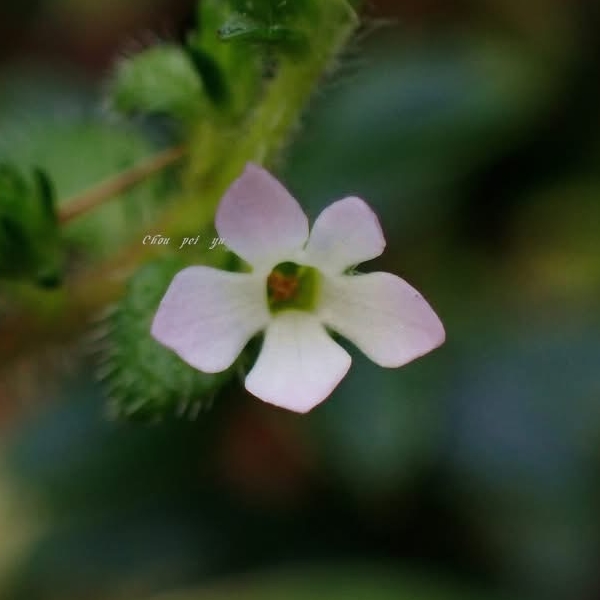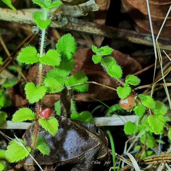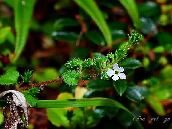 (原生種;原生於台灣、菲律賓、印尼摩鹿加群島、中國大陸至緬甸;多年生葡匐性草本;全株密被毛;單葉對生;葉有2型,夏葉心形(鋸齒緣),冬葉針形(簇生);花朵單生葉腋;花冠筒狀,花瓣5枚,白色至粉紫色;花萼5枚,披針形;果實