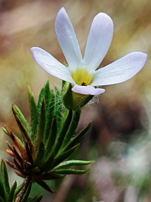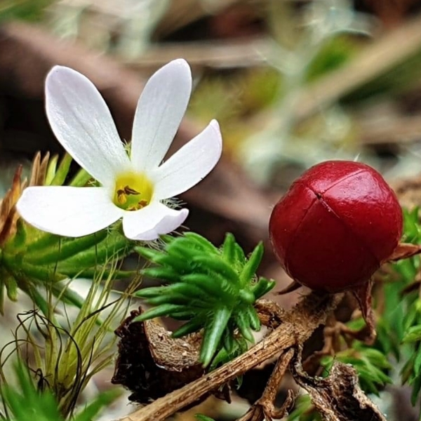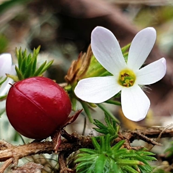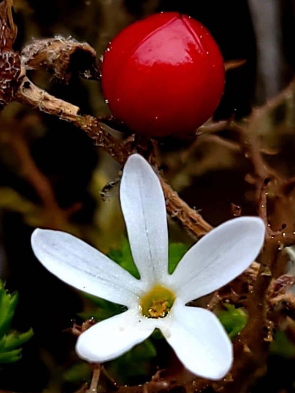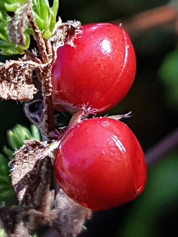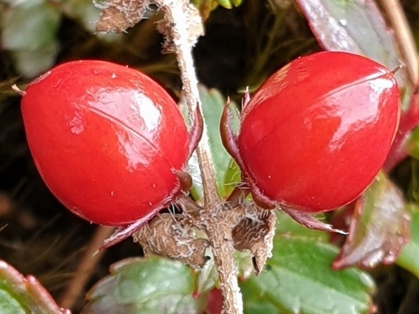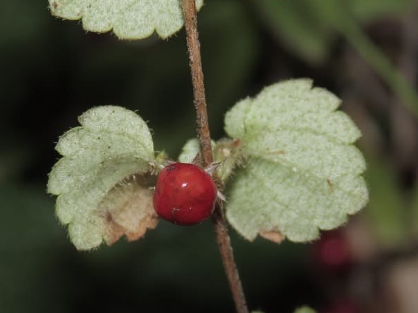![]() 上面照片:鄭演義拍攝 (全株密被毛;單葉對生;葉有2型,夏葉心形(鋸齒緣),冬葉針形(簇生);花朵單生葉腋;花冠筒狀,花瓣5枚,白色至粉紫色;花萼5枚,披針形;果實 卵球形,成熟紅色) |