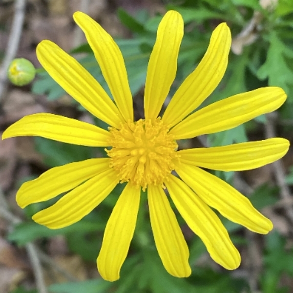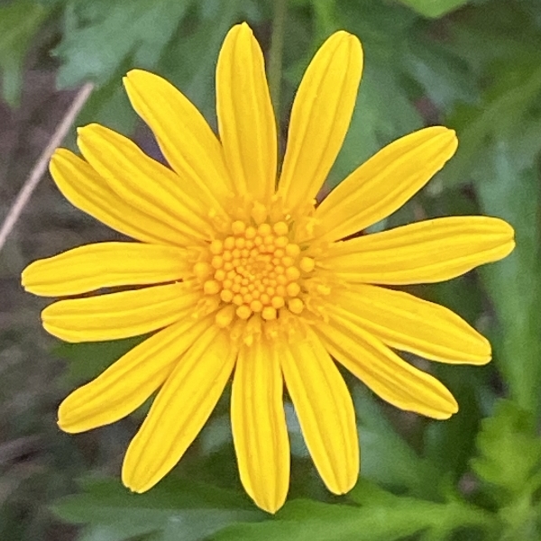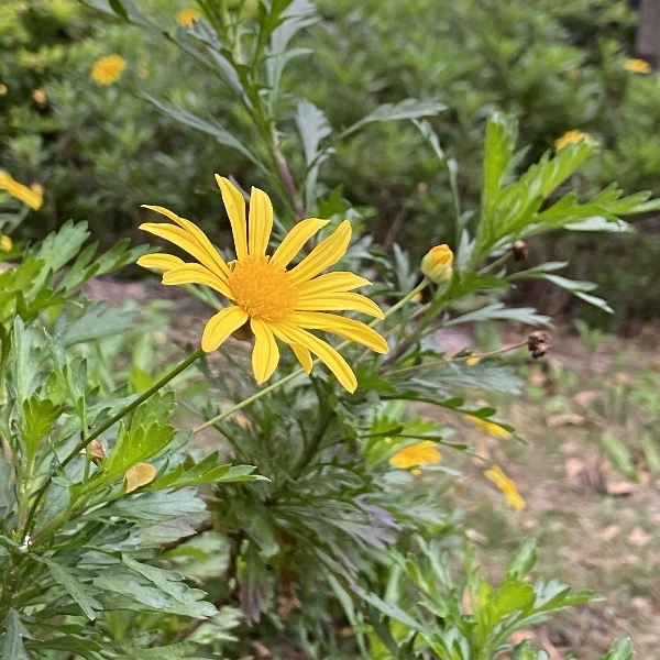 (栽培種;原生於南非;中國植物智標名淺齒梳黃菊;多年生草本或半灌木;株高約50公分,莖直立,多分枝,老莖木質化;單葉互生,1~2回羽狀複葉;頭花梗特長,花冠黃色)
