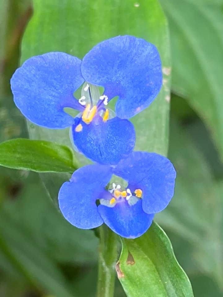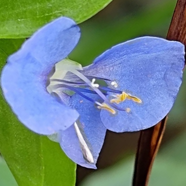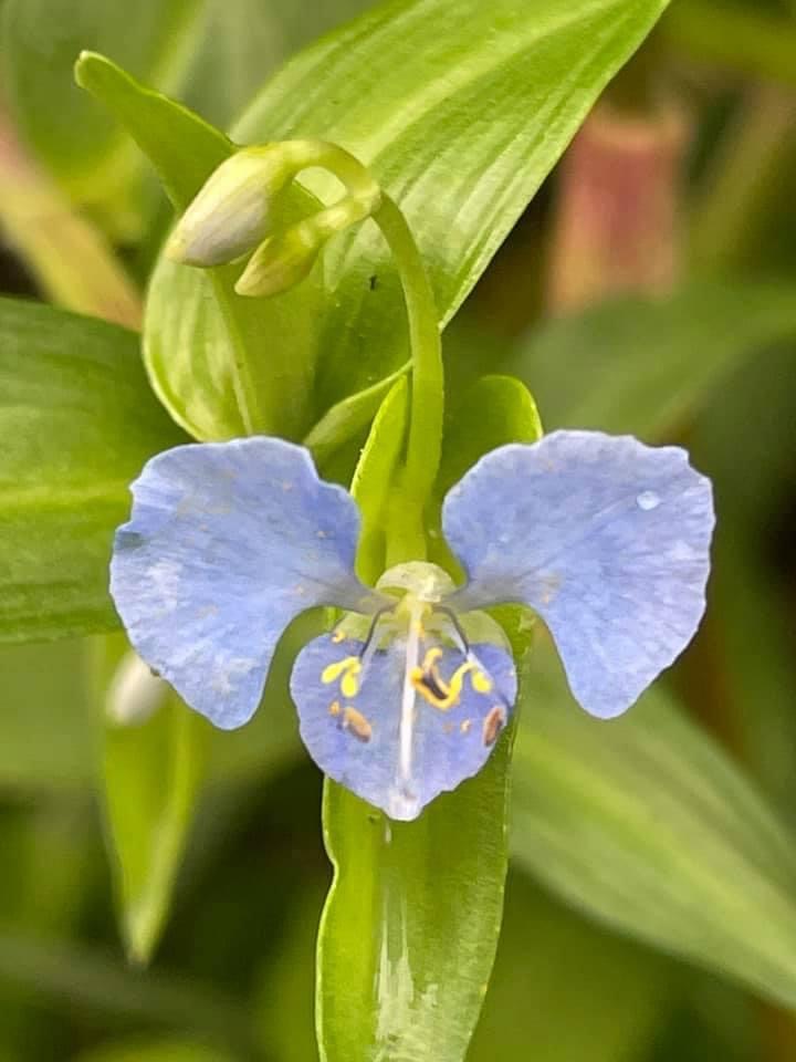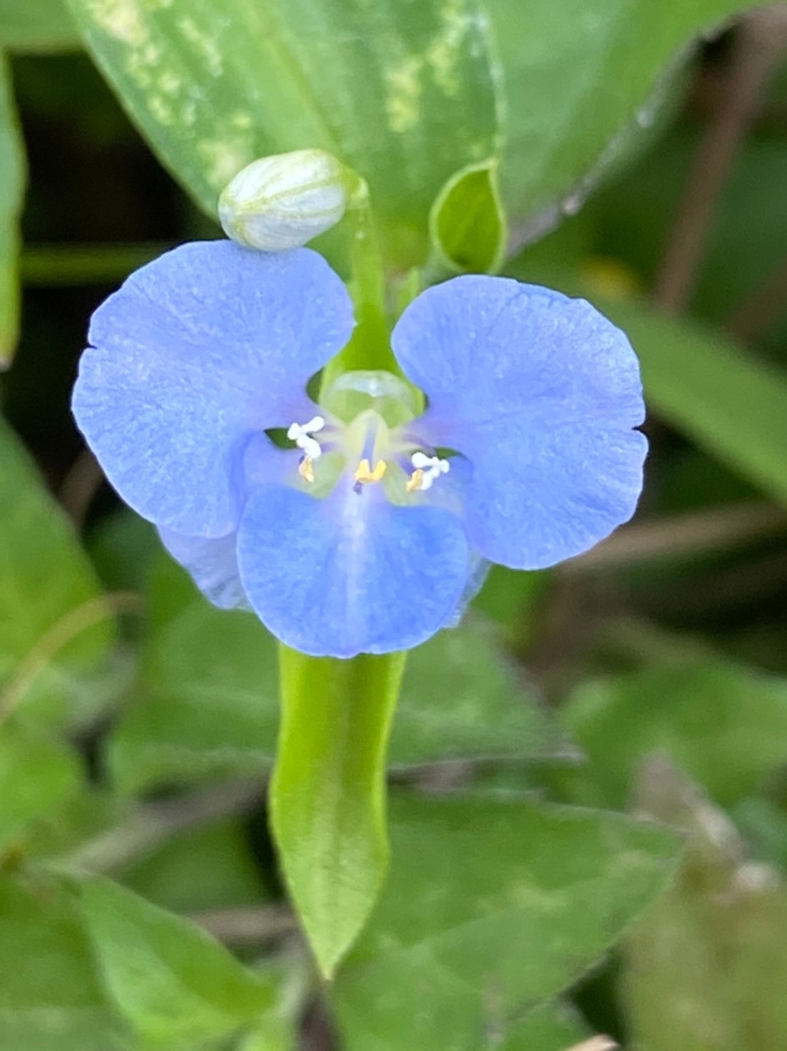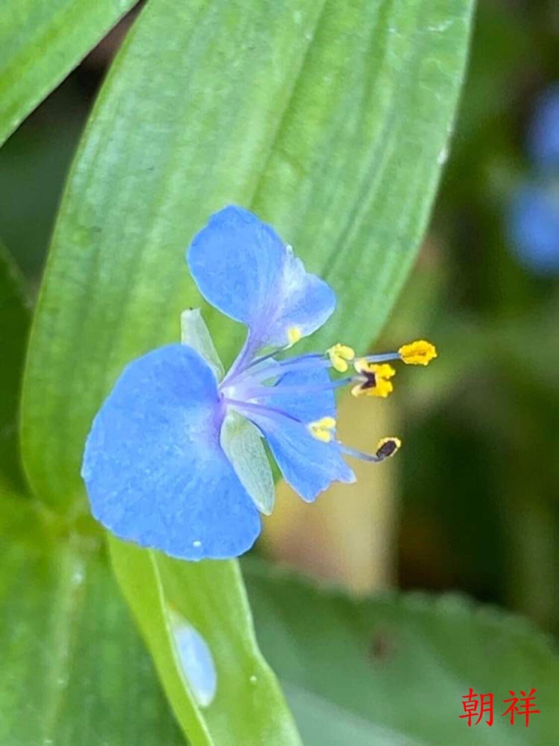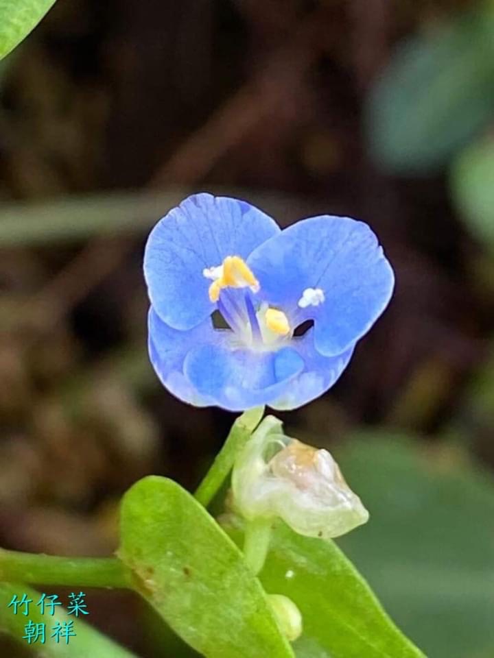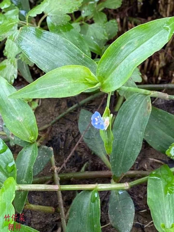 (原生種;原生於台灣、日本至非洲一帶;台灣物種名錄標名竹仔菜,別名節節草;維基百科標名節節草,別名竹節菜、竹節花;草本;匍匐生長;莖常呈紫紅色;單葉對生,長卵形至披針形,葉鞘抱莖;花序與葉片對生,具苞片,有花2朵,苞片邊緣分離;花瓣3枚(2大1小),藍色,具柄;花絲藍色;蒴果卵形)