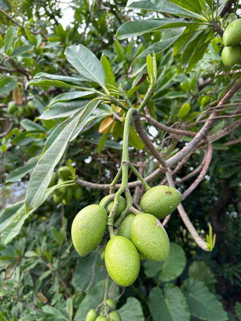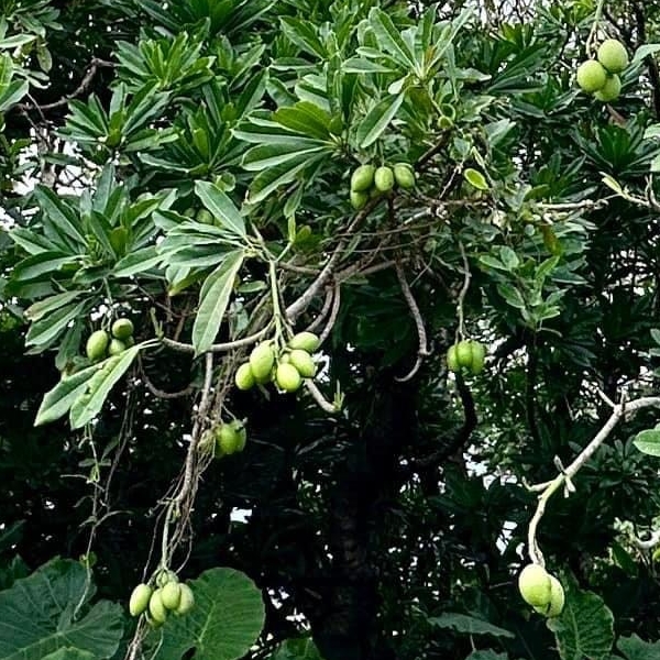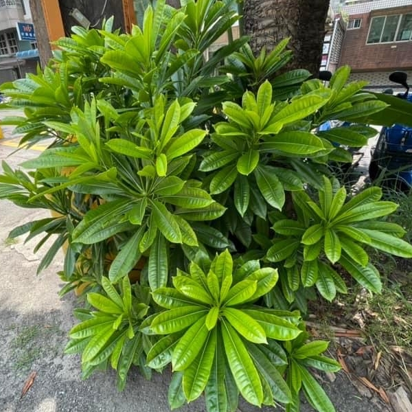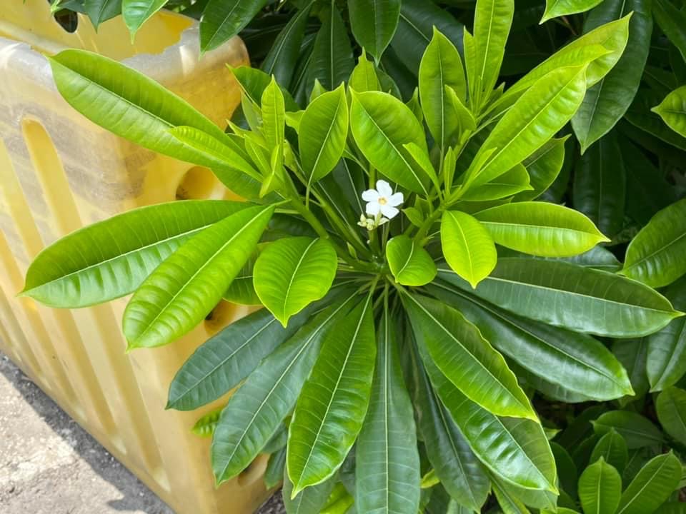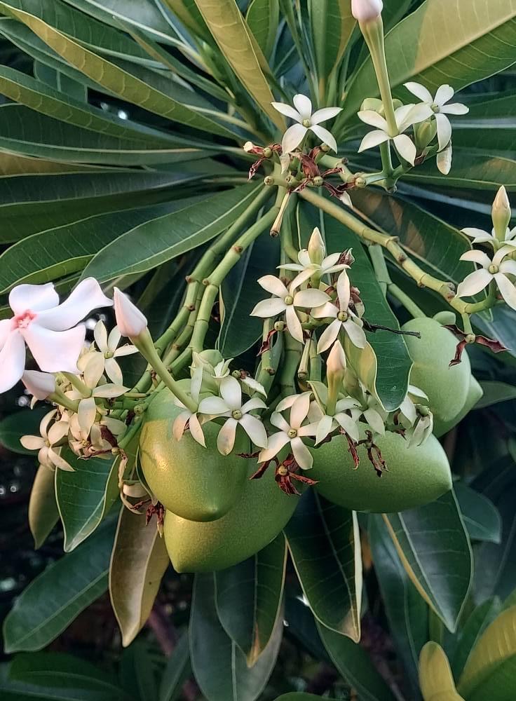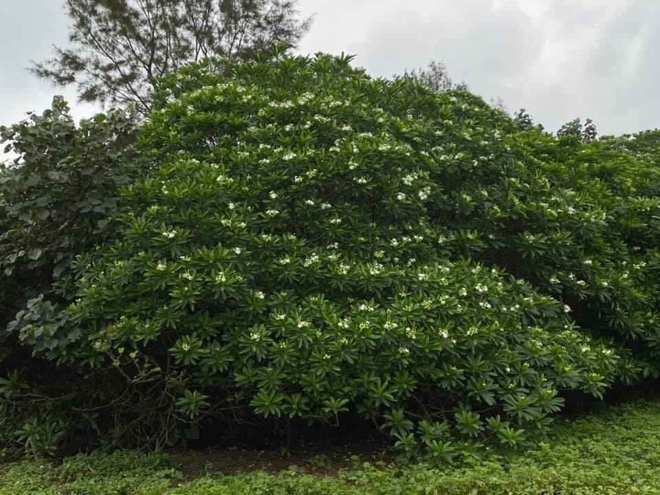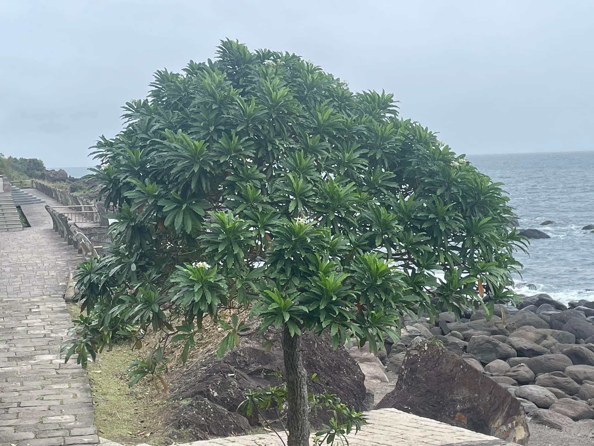 (原生種;維基百科標名海杧果;常綠小喬木;單葉互生,倒披針形,革質,叢生枝端;聚繖花序,頂生;花冠長漏斗形,花瓣5枚,白色,中心有橘紅色;花5枚,綠白色;核果,卵形至橢圓形,成熟紅色至紫色,可藉潮水漂流傳送;全株具白色乳汁,有毒性;耐風力強,可作為海濱地區防風及防潮之樹種)