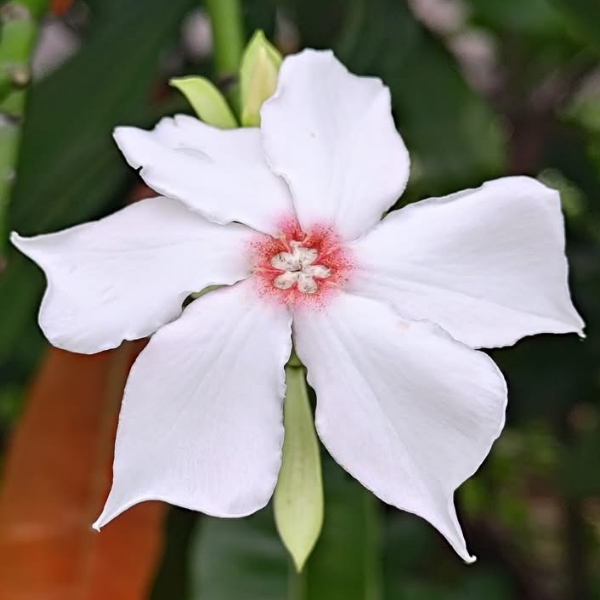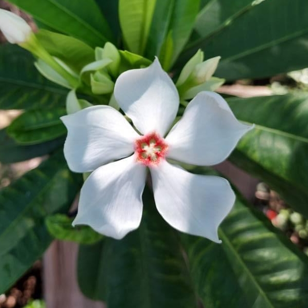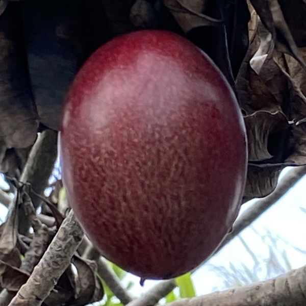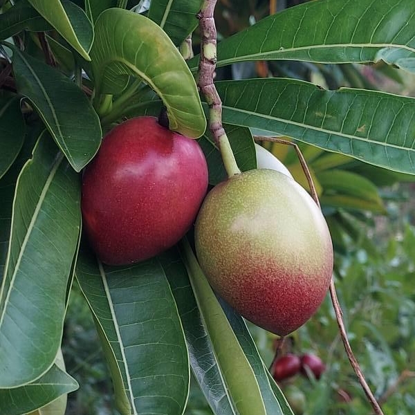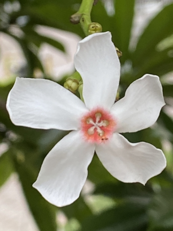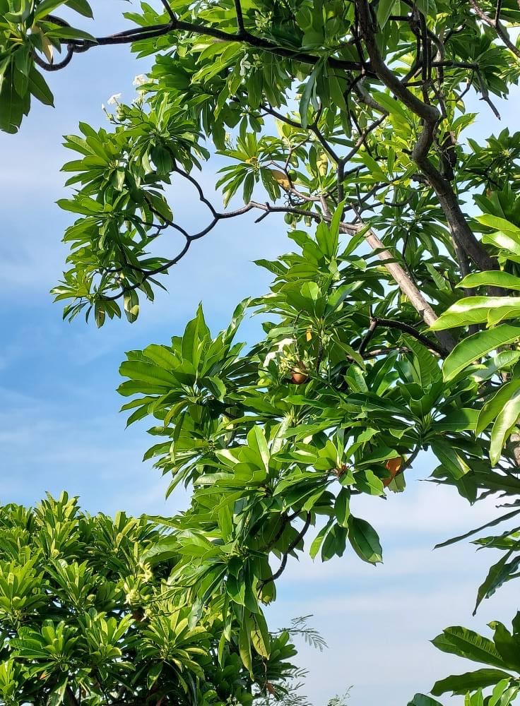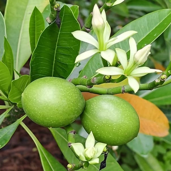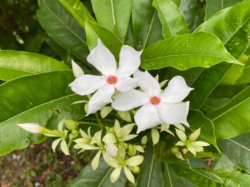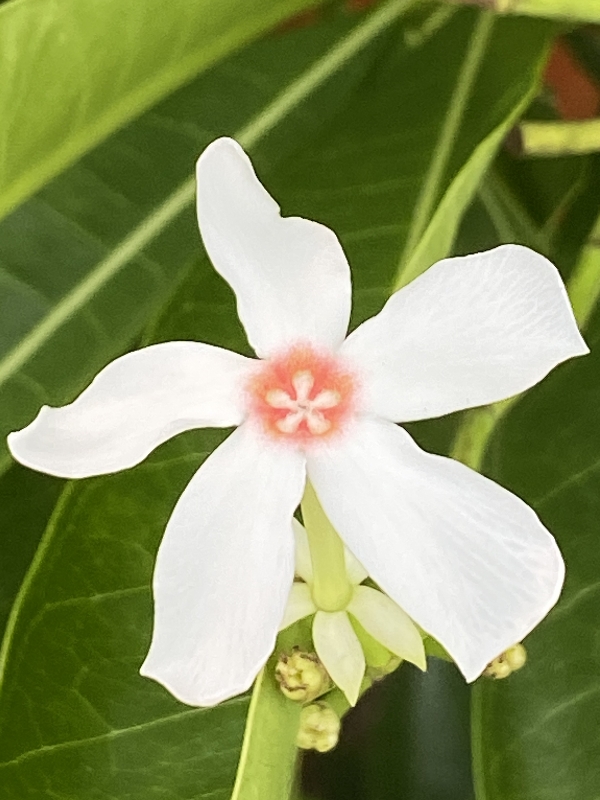 (原生種;維基百科標名海杧果;常綠小喬木;單葉互生,倒披針形,革質,叢生枝端;聚繖花序,頂生;花冠長漏斗形,花瓣5枚,白色,中心有橘紅色;花5枚,綠白色;核果,卵形至橢圓形,成熟紅色至紫色,可藉潮水漂流傳送;全株具白色乳汁,有毒性;耐風力強,可作為海濱地區防風及防潮之樹種)