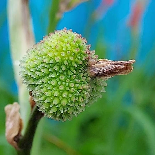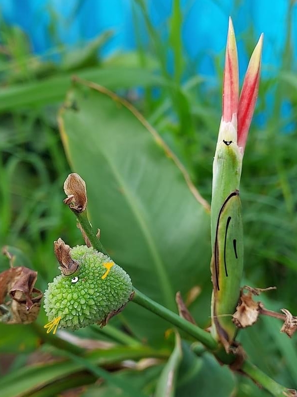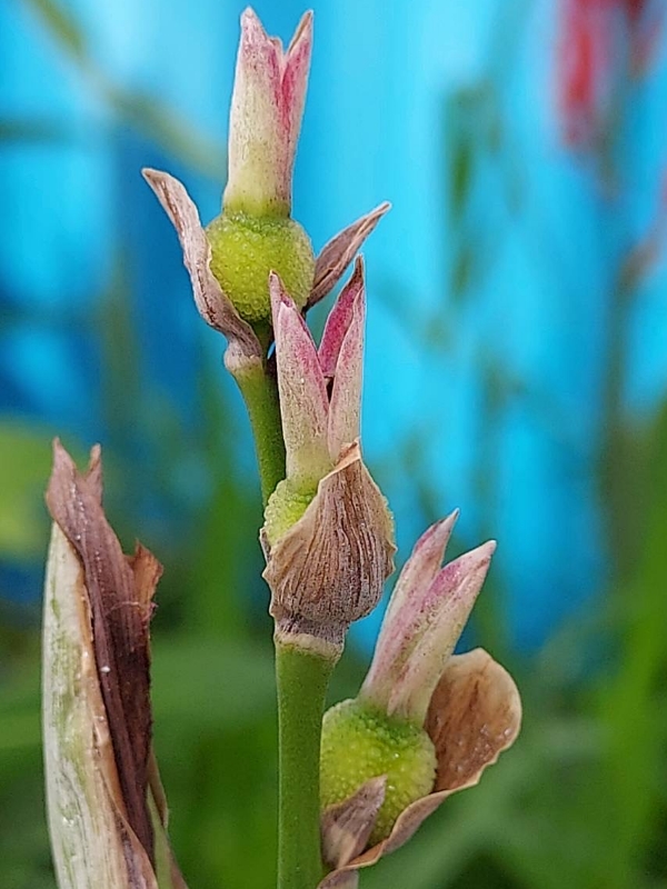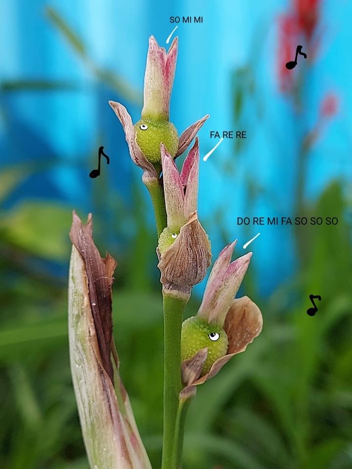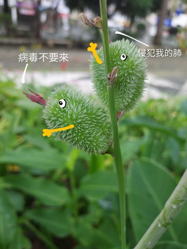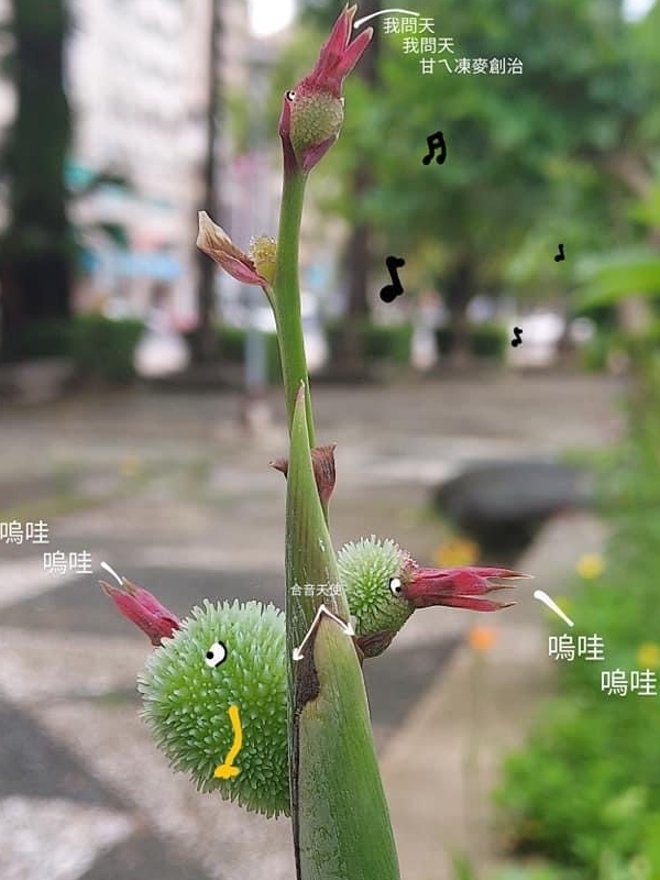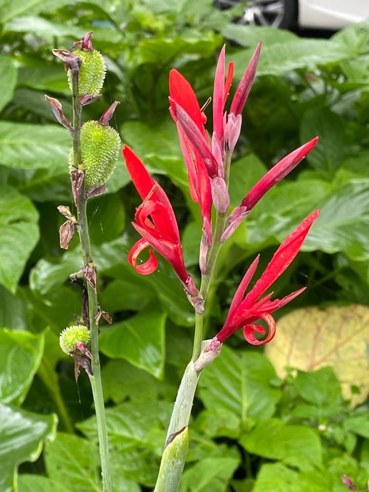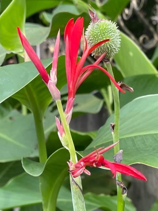 (歸化種;原產於中、南美洲一帶;多年生草本;根莖塊狀;單葉互生,長橢圓形,全緣;總狀花序,具苞片;花瓣有紅、黃、白...等色;蒴果卵形,3瓣狀,表面具小軟刺,成熟黑褐色;蒴果內含種子5~15枚,種子球形,成熟黑色,堅硬;根莖可食用)