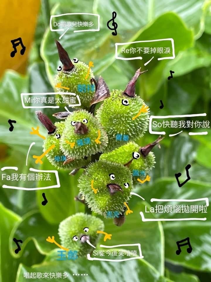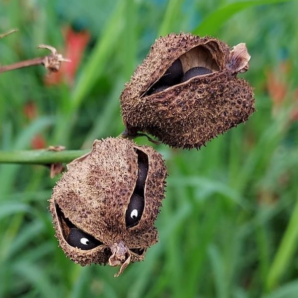 ![]() 上面照片:張儷蓁拍攝 (總狀花序,具苞片,花大多成對;花瓣3枚,有紅色、黃色、白色...等色;蒴果卵形,3瓣狀,表面具小軟刺,成熟黑褐色;蒴果內含種子5~15枚,種子球形,成熟黑色,堅硬) |