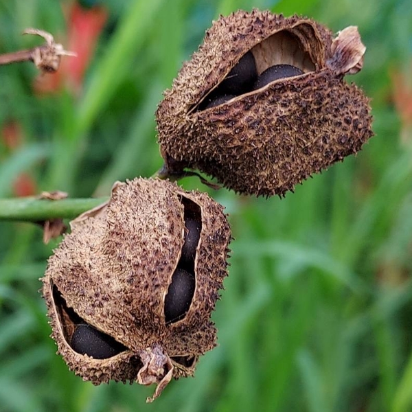 ![]() 上面照片:張儷蓁拍攝 (蒴果卵形,3瓣狀,表面具小軟刺,成熟黑褐色;蒴果內含種子5~15枚,種子球形,成熟黑色,堅硬) |