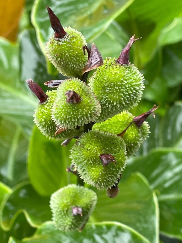 ![]() 上面照片:陳維琪拍攝 (蒴果卵形,3瓣狀,表面具小軟刺,成熟黑褐色;蒴果內含種子5~15枚,種子球形,成熟黑色,堅硬) |