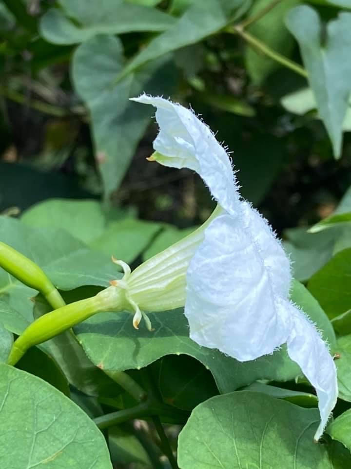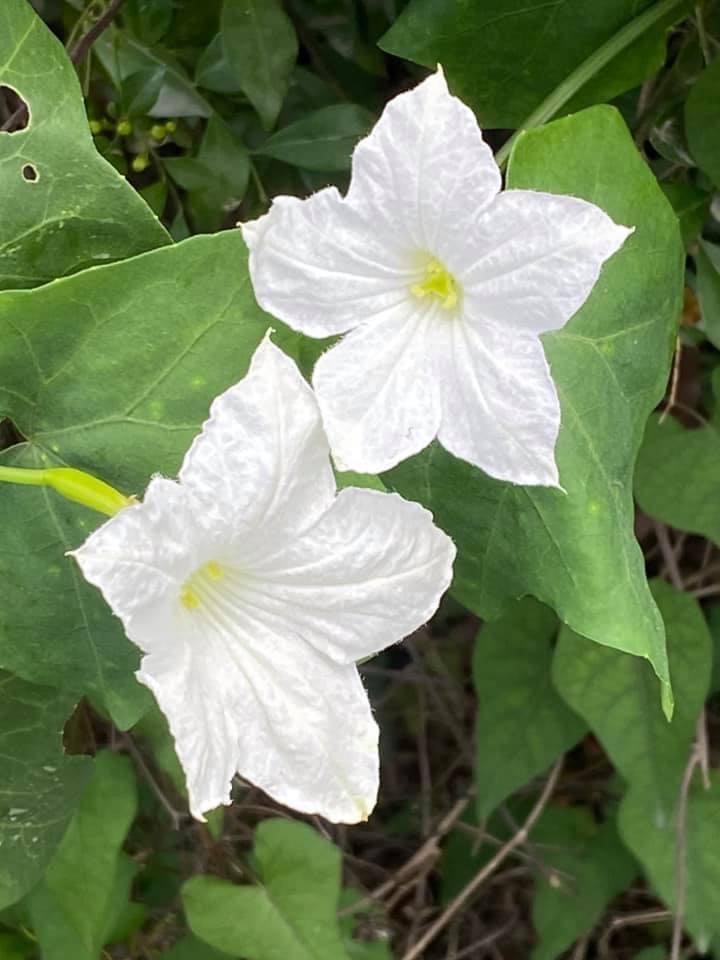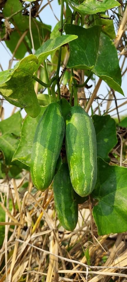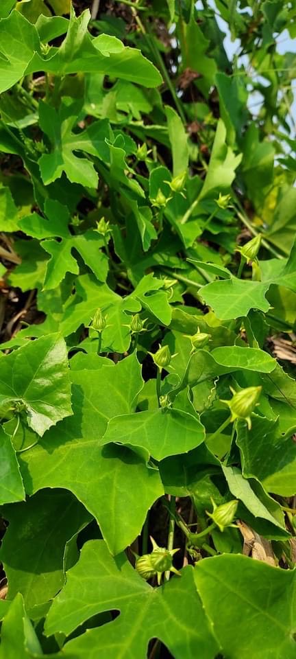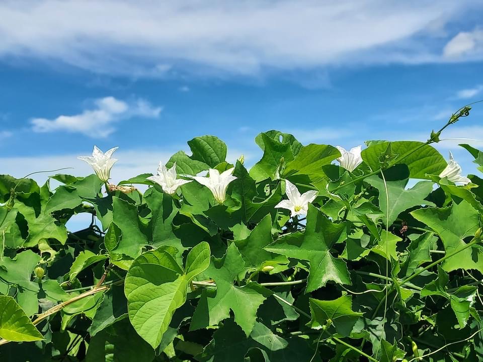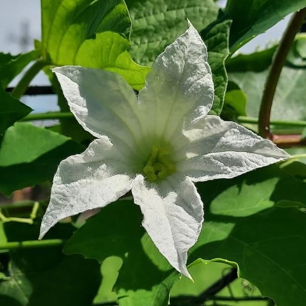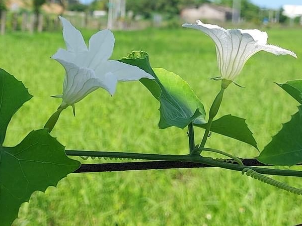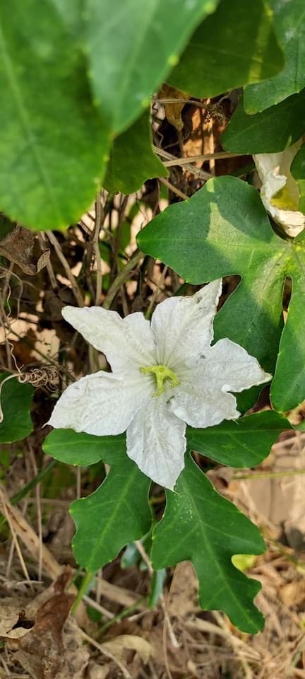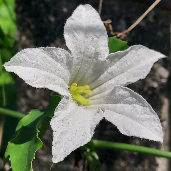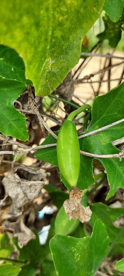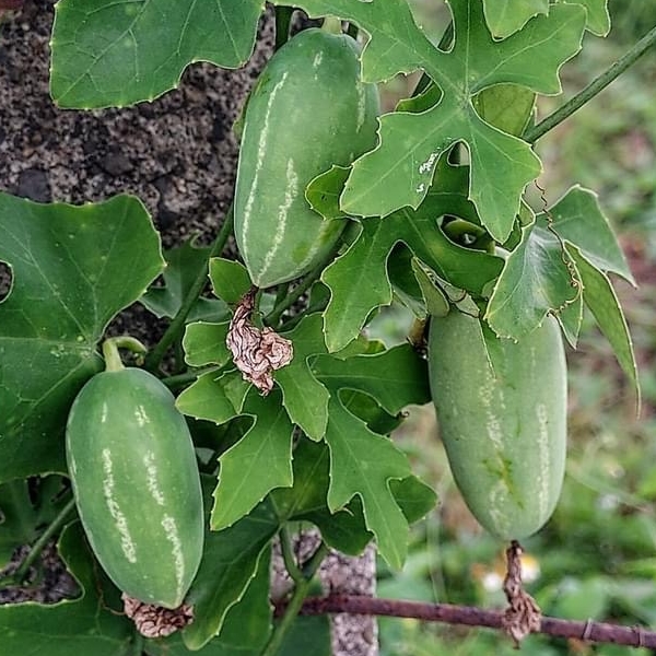(歸化種;原生於中國大陸至非洲一帶;多年生草質藤本;雌雄異株;單葉互生,五角形至3-5裂的掌狀裂葉;卷鬚單一;花序腋生,具長梗;雄花單生或2-3朵簇生;雌花單一,柱頭3叉;花瓣5枚,白色;瓠果長橢圓形,具西瓜紋路,成熟紅色;全株可食用)