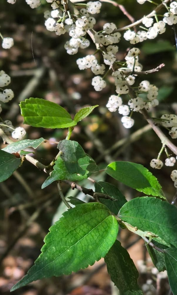 ![]() 上面照片:潘玉郎拍攝 (單葉互生,長卵形、橢圓形至卵狀披針形,鋸齒緣,基出三脈,葉背脈上常呈淡紫色) |