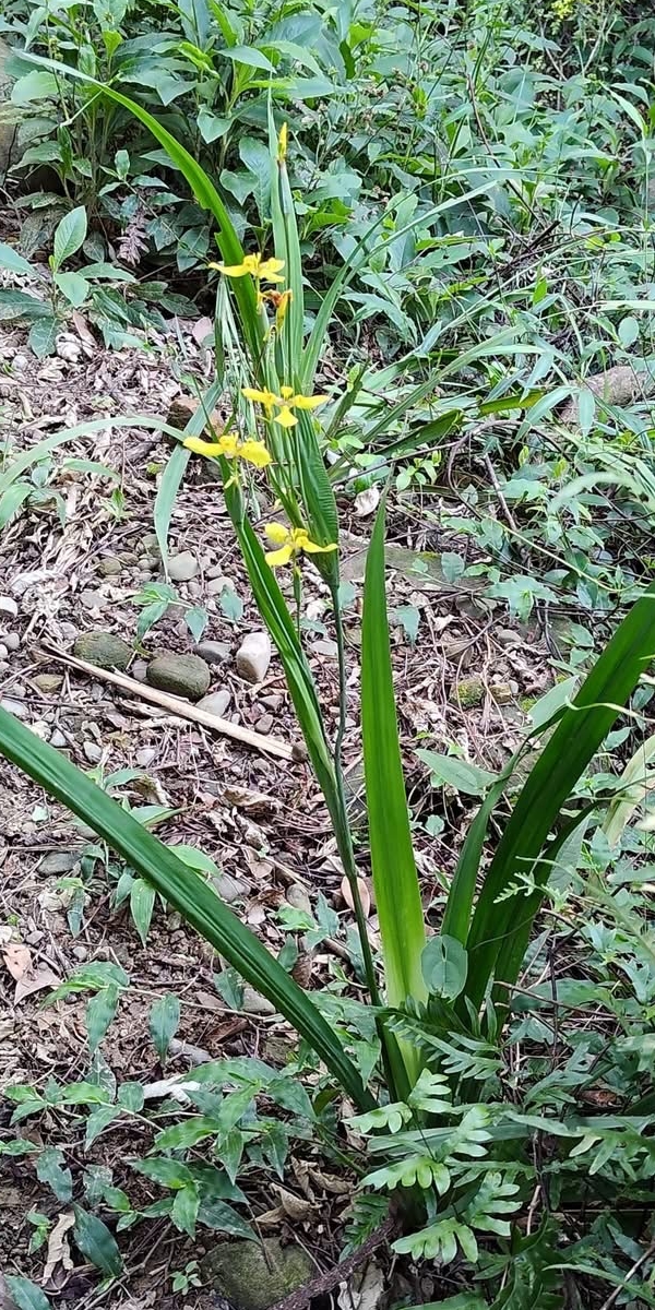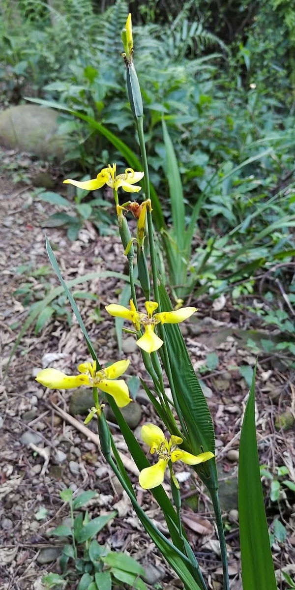 (栽培種;原生於中美洲附近一帶(含南美洲的哥倫比亞和委內瑞拉,不含巴西);世界植物在線 POWO 附有照片(相符);台灣物種名錄20260323標名黃扇鳶尾,標示學名 Trimezia martinicensis (此學名在 POWO 的照片,為花形相似,但葉形不同的物種,應是誤勘或誤植);維基百科英文版標示學名 Trimezia fosteriana (查 POWO 原生於委內瑞拉),附有照片(相符);維基百科中文版標名黃扇鳶尾,標示學名 Trimezia steyermarkii,附有照片(相符);亦有人指稱 Trimezia martinicensis 是黃扇鳶尾,Trimezia steyermarkii 是粗點黃扇鳶尾;暫以 POWO 的學名,以及維基百科的中文名為正名;多年生草本;黃扇鳶尾花鞘內的黃花開完後會長出小苗,這種現象在植物學上稱為「胎生現象」,隨著小苗長大,花莖會下垂至地面,小苗便能著地發根成為新的植株)