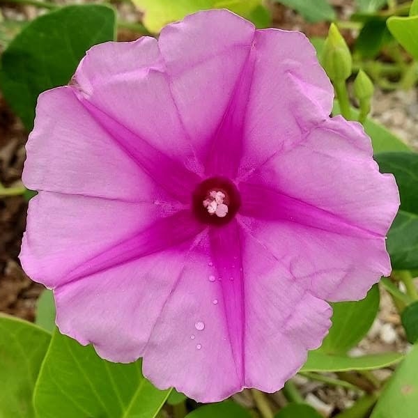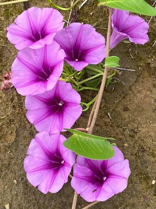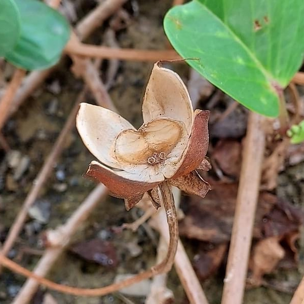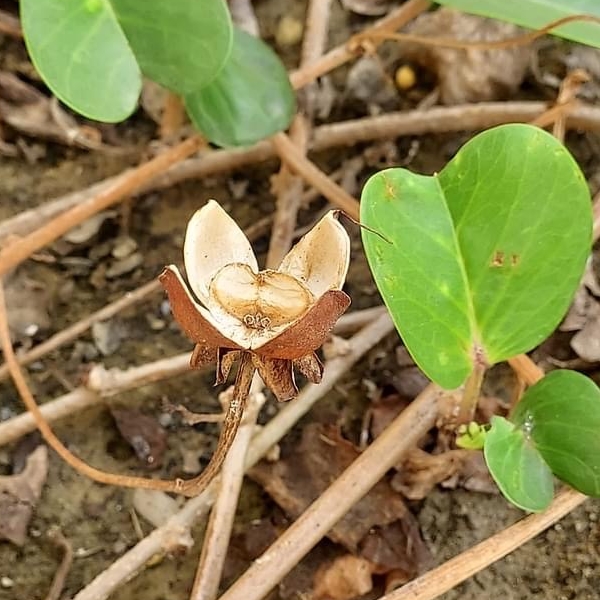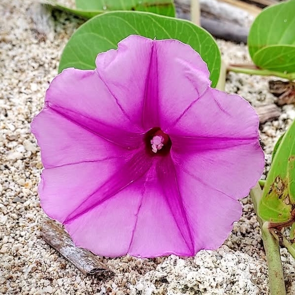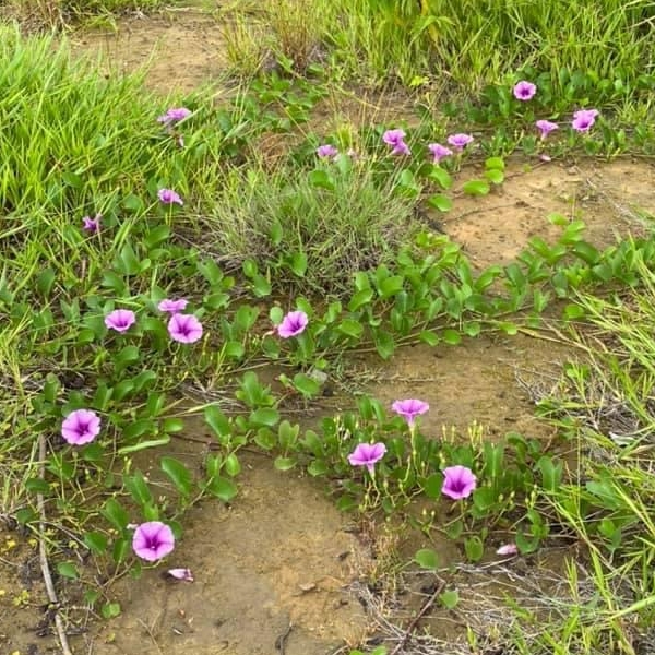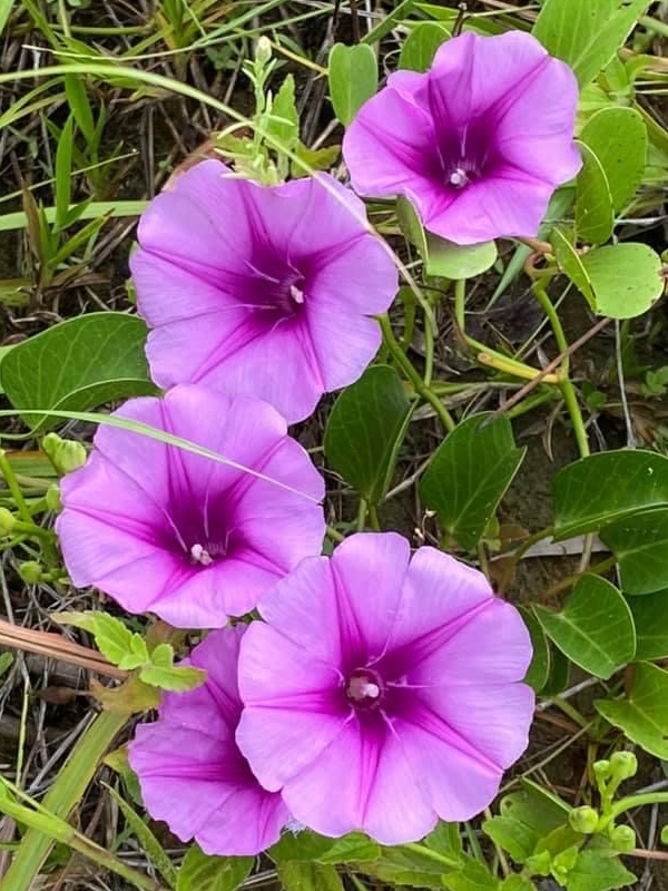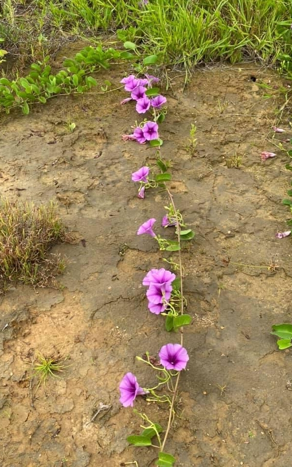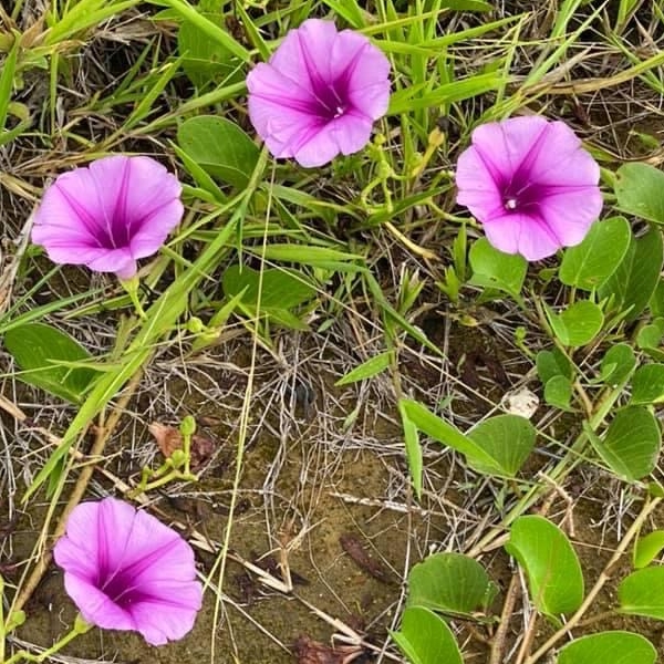 (原生種;原生於世界各地的熱帶和副熱帶;世界植物在線 POWO 標示 Ipomoea pes-caprae subsp. brasiliensis = Ipomoea pes-caprae,皆為有效學名;香港柴娃娃植物網標名海灘牽牛;葉形如馬鞍,故名馬鞍藤;素有「海濱花后」之稱;清晨開放,過午凋謝)