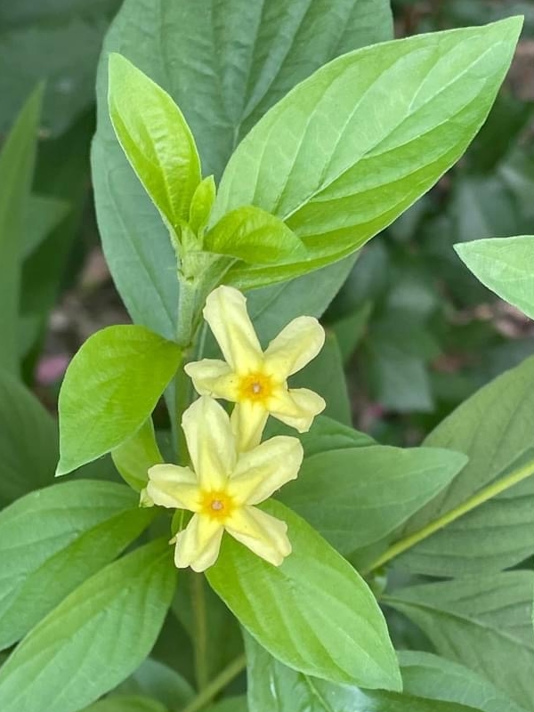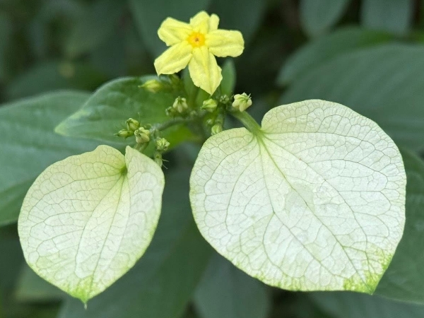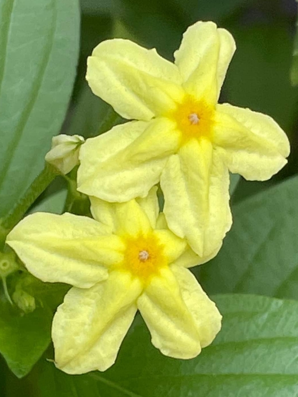 ![]() 上面照片:張儷蓁拍攝 (聚繖花序,頂生;花冠筒狀;花瓣5枚,黃色,中間有明顯之星狀突起;花萼5枚,1枚特化成萼葉,卵形,淺黃色) |