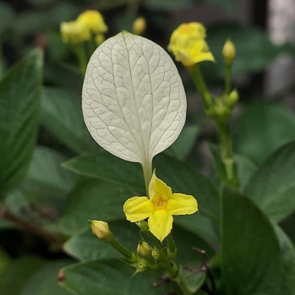 (栽培種;原生於非洲中部一帶;香港柴娃娃植物網標名黃萼花;常綠灌木至半灌木;單葉對生,長卵形;聚繖花序,頂生;花冠筒狀;