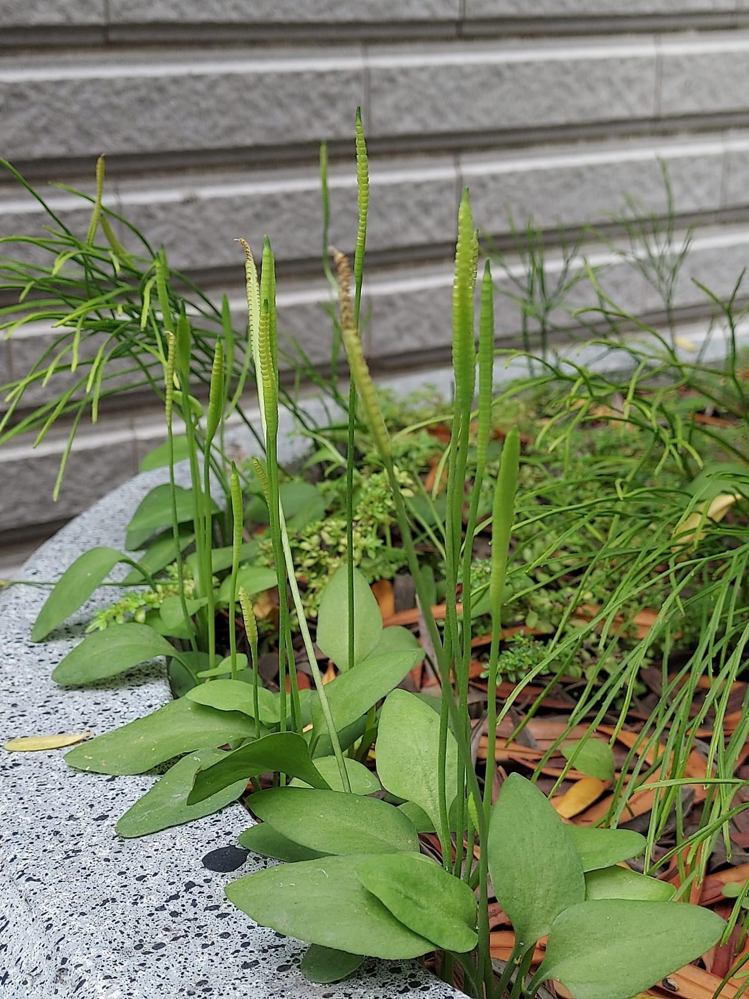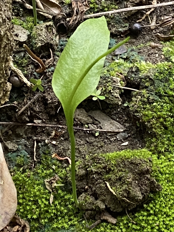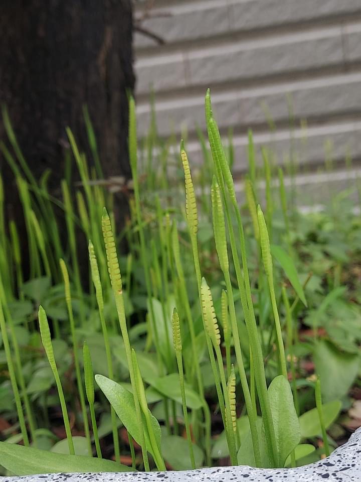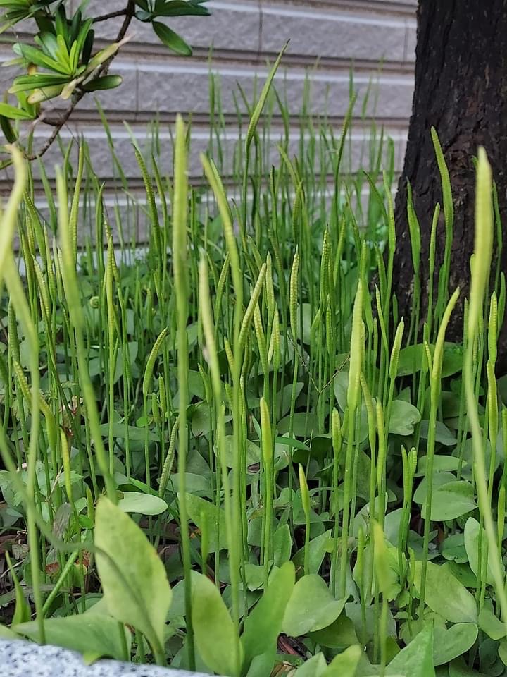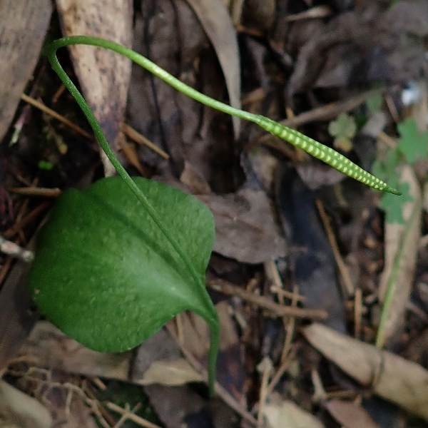 (原生種;原生於台灣、日本至印度和紐西蘭一帶;蕨類植物;台灣物種名錄標名銳頭瓶爾小草,別名鈍頭瓶爾小草(銳和鈍意思相反),附有照片;具走莖;單葉,卵形至長卵形,全緣)