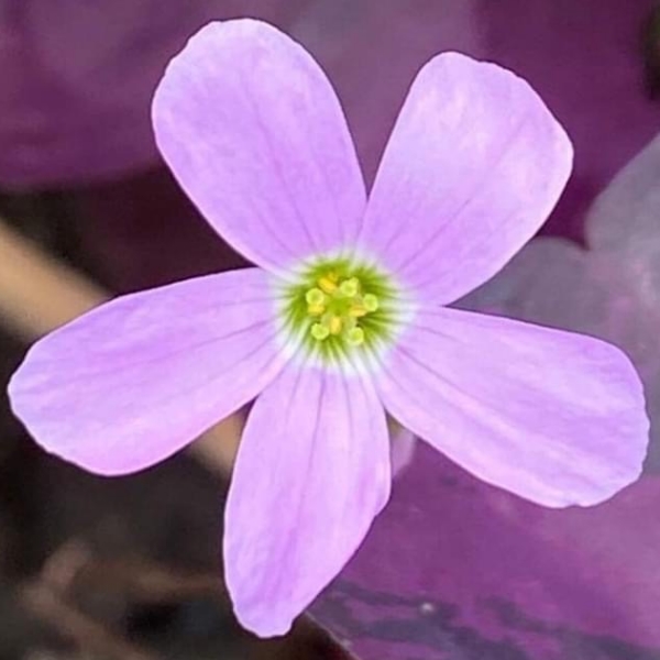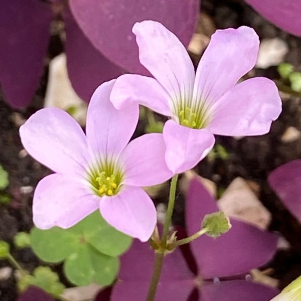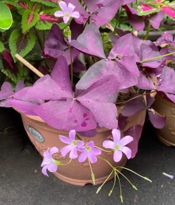 (栽培種;原生於南美洲;世界物種名錄附有照片(葉片綠色至紫紅色);台灣物種名錄20260126查無此學名及中文名;維基百科標名南美三角酢漿草,別名紫蝴蝶酢漿草、紫葉酢漿草、三角紫葉酢漿草,附有照片(相符);多年生草本植物;莖甚短;三出複葉,互生,叢生;小葉三角形,紫紅色,葉柄特長;繖形花序,腋生,花梗特長;花瓣5枚,粉紅色)