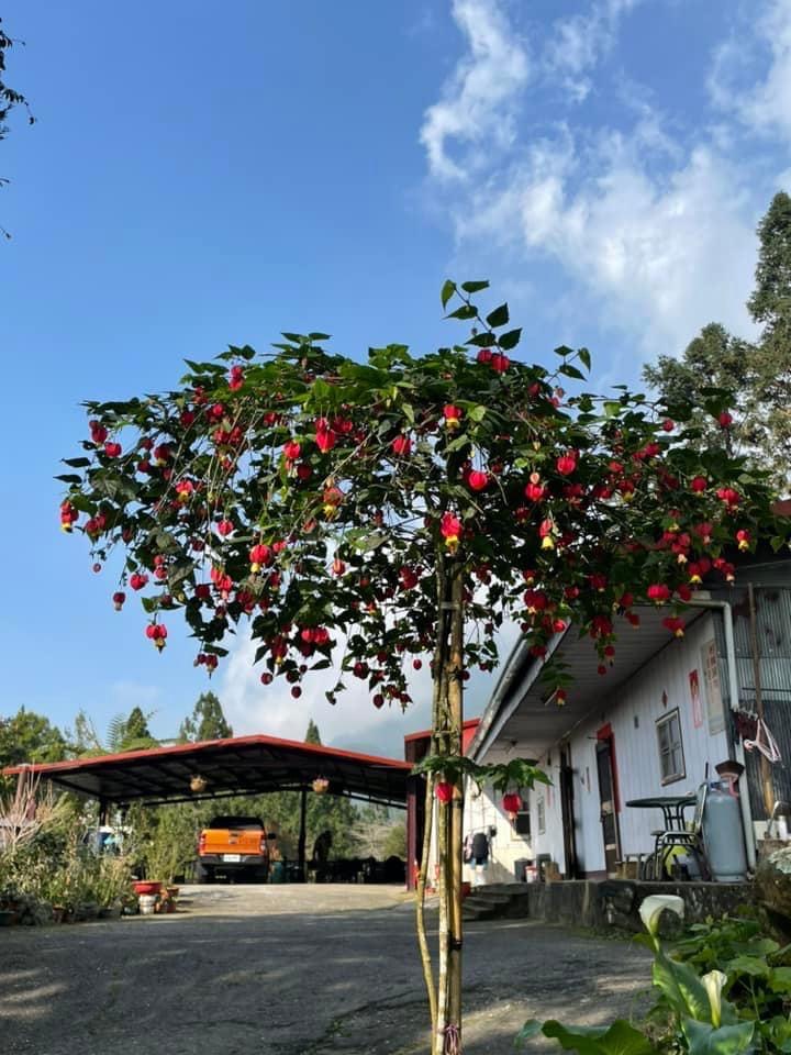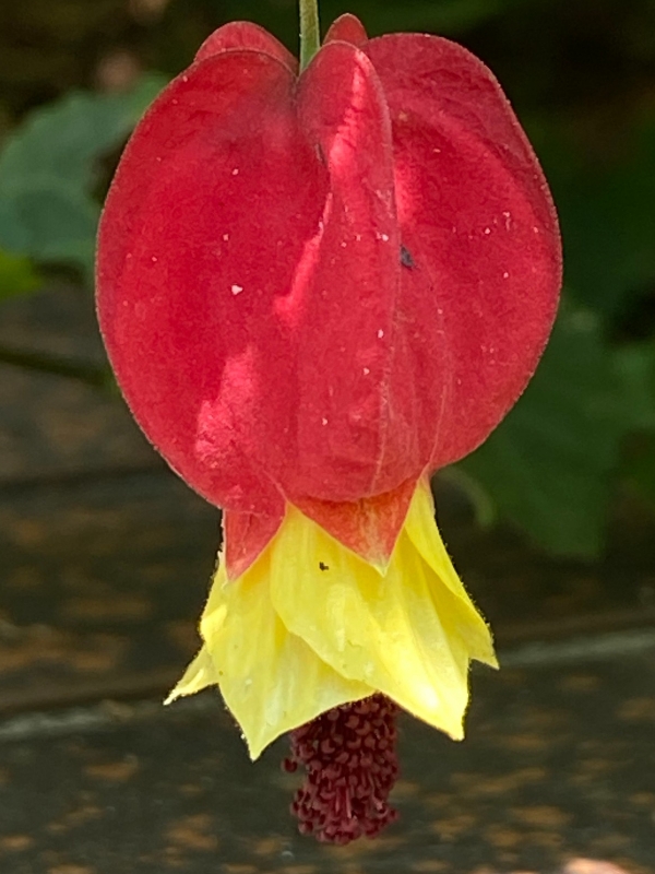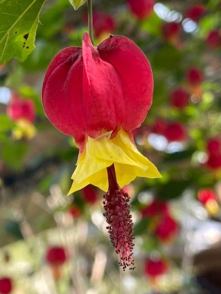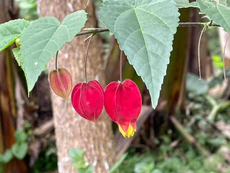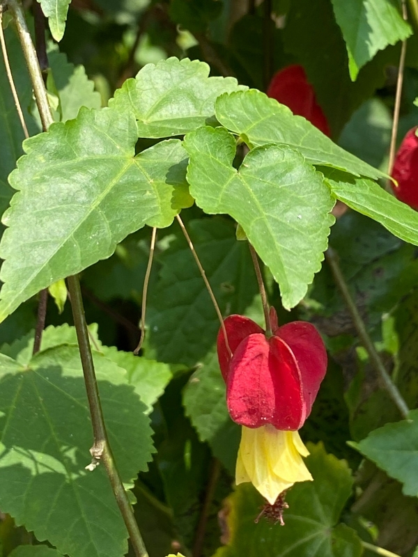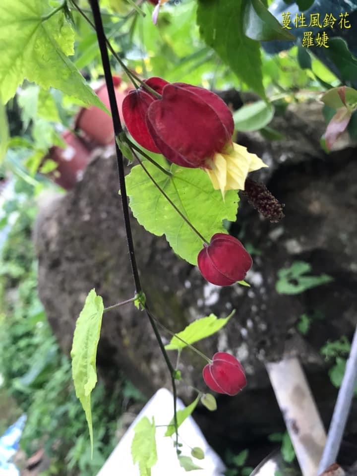 (栽培種;原生於南美洲烏拉圭;世界植物在線標示 Abutilon megapotamicum = Callianthe megapotamica,皆為有效學名;台灣物種名錄查無此學名及中文名;香港柴娃娃植物網標名蔓性風鈴花;菁芳園標名紅燈籠;單葉互生,心形或淺掌裂,鋸齒緣;花朵單生葉腋,花梗細長,下垂;花瓣5枚,黃色;花萼紅色)