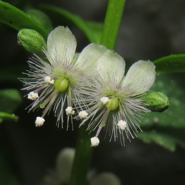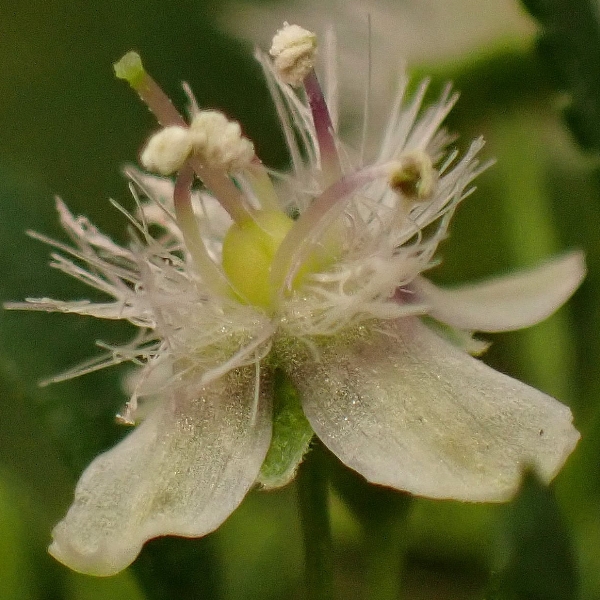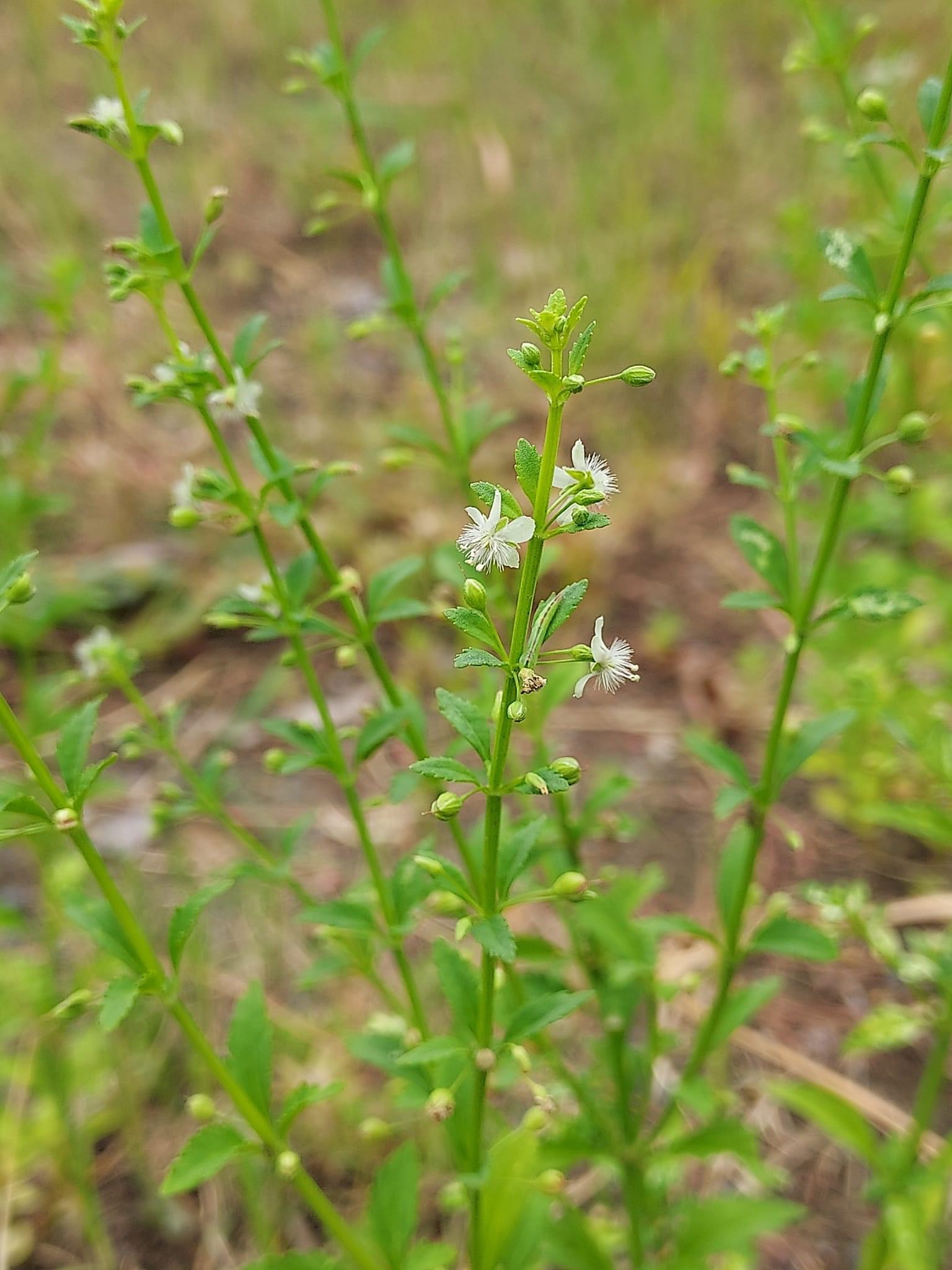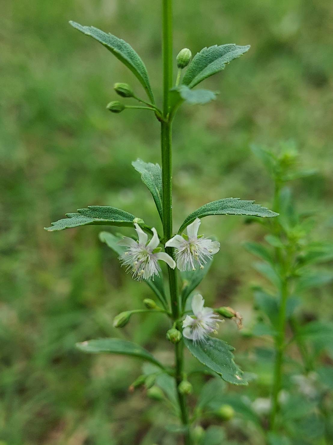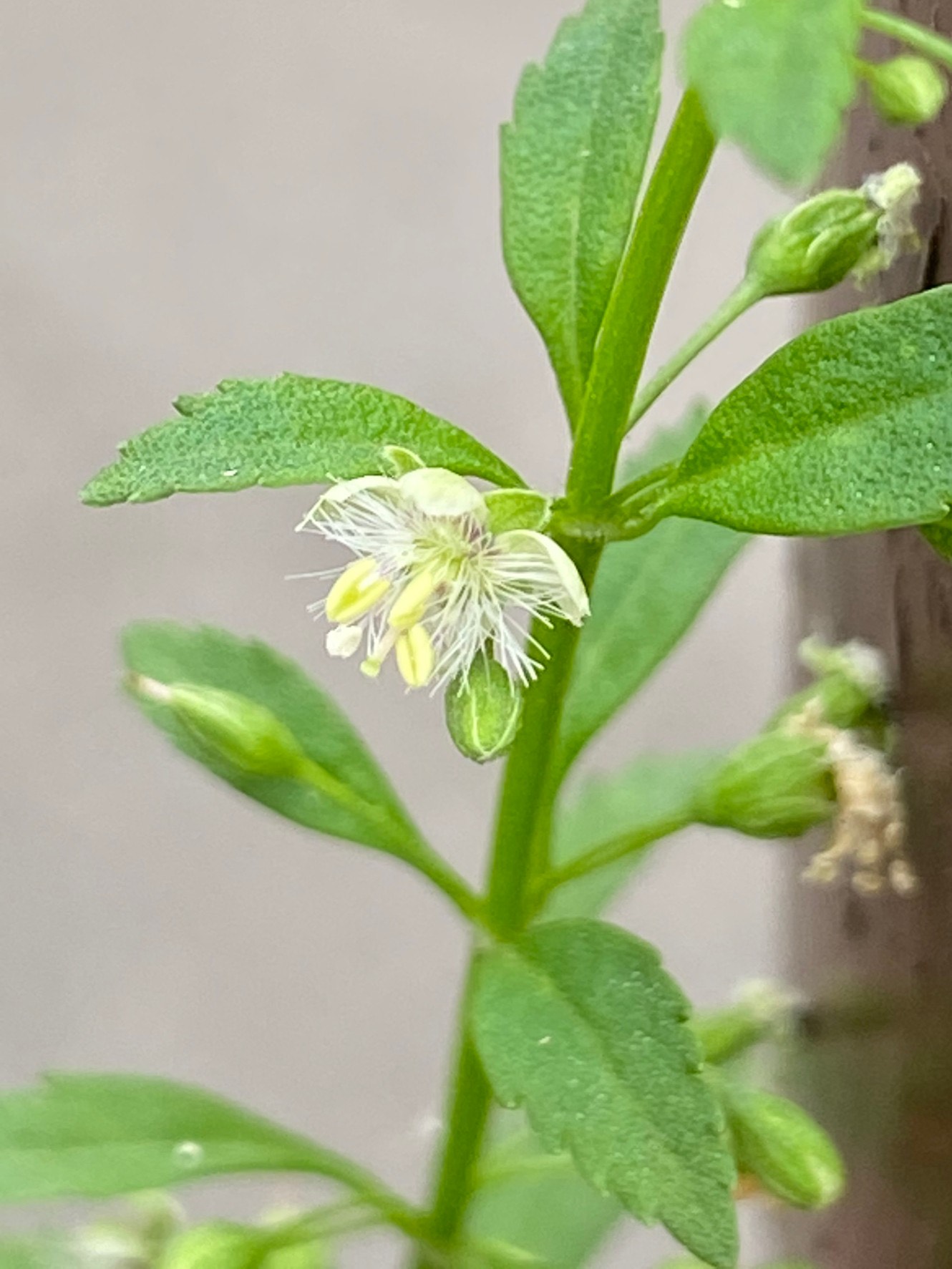 (歸化種;原產於中、南美洲;台灣物種名錄和維基百科標名野甘草;香港柴娃娃植物網標名冰糖草;直立草本;下部木質化;單葉對生或3葉輪生,卵形至橢圓形,鋸齒緣,具短柄;花朵單生或數朵生於葉腋,花瓣4枚,白色,花梗細長,喉部具毛,直條狀;雄蕊4枚;蒴果球珠狀)