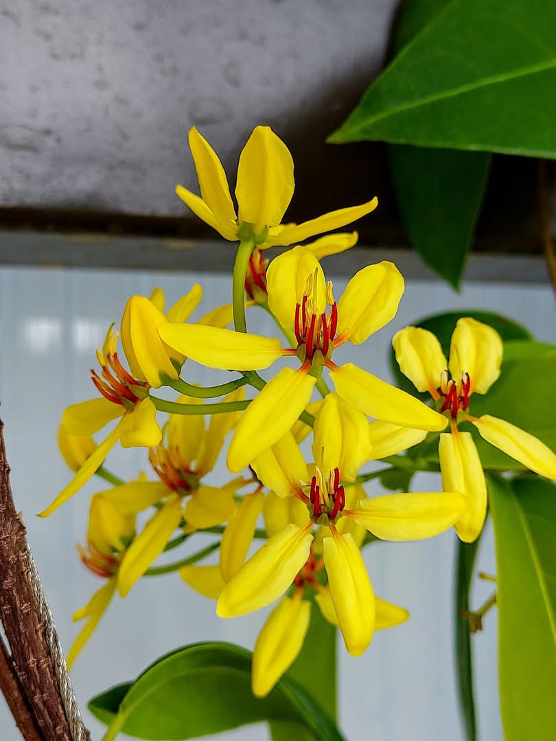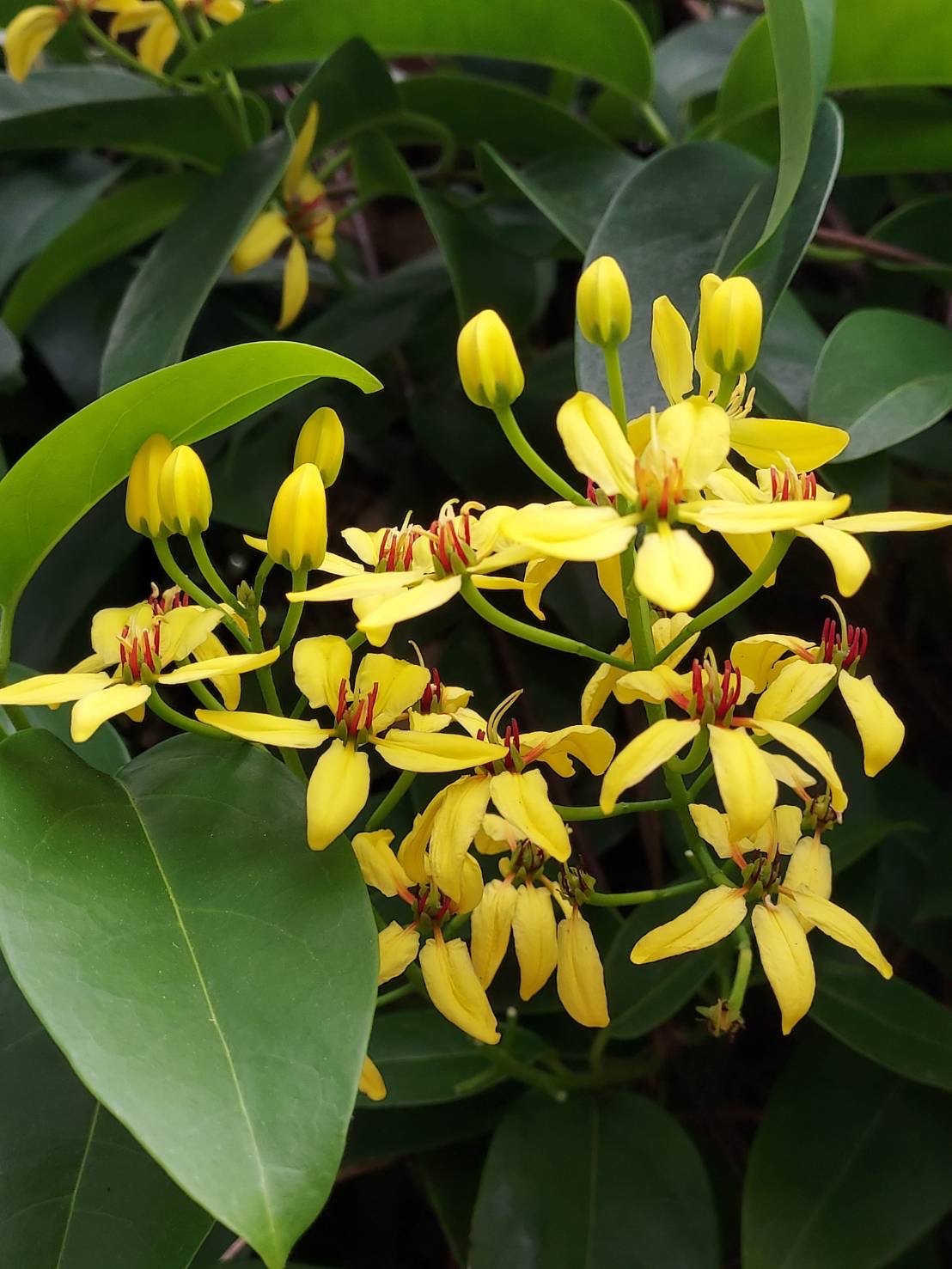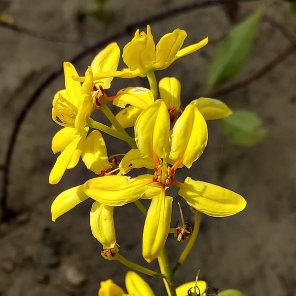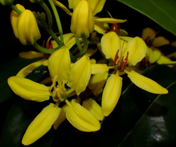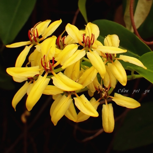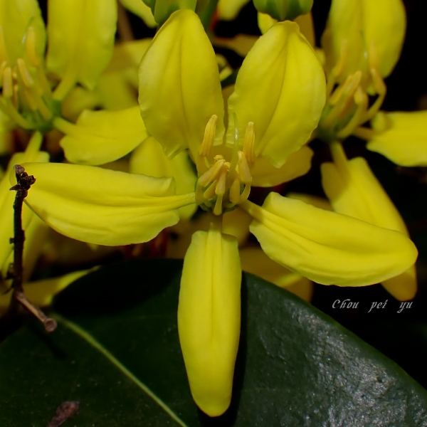 ![]() 上面照片:周佩玉拍攝 (總狀花序,腋生或頂生;花瓣5枚,黃色,具瓣柄;雄蕊黃色至紅色) |