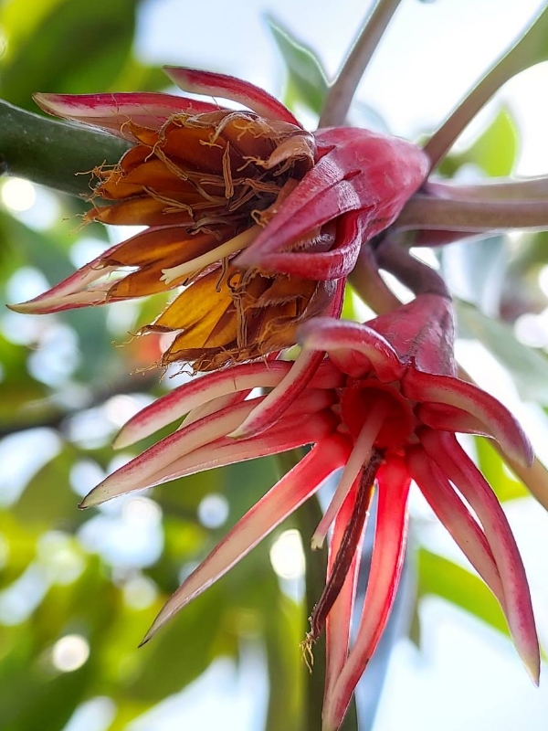 ![]() 上面照片:陳維琪拍攝 (花朵單生,腋生;萼筒紫紅色,花萼8~12枚,線狀披針形,紫紅色;花瓣與花萼同數,略短於花萼;雄蕊多數) |