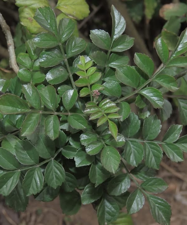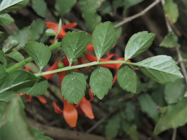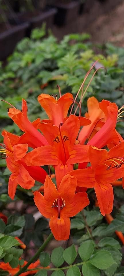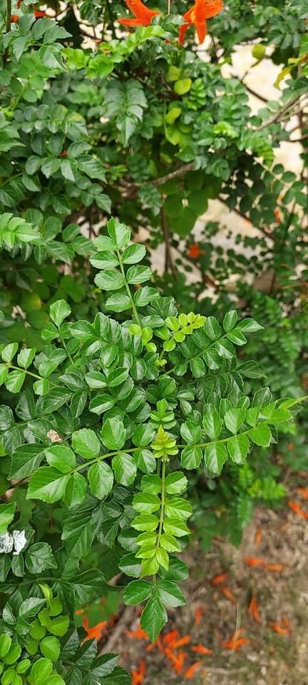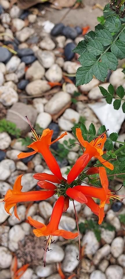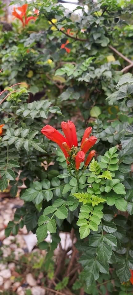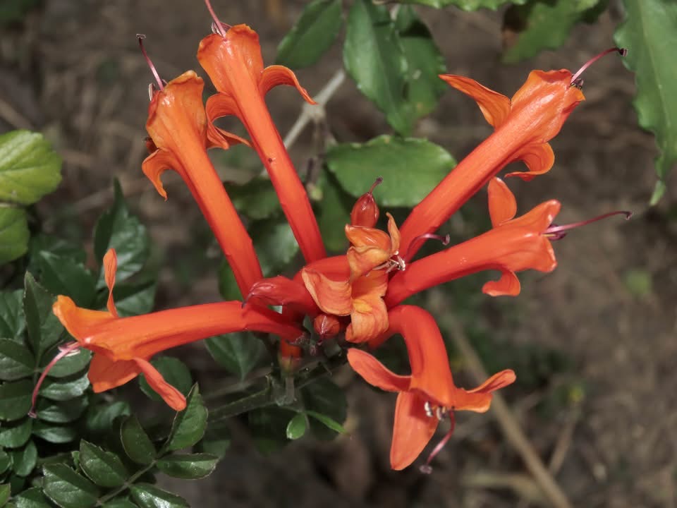 (栽培種;原生於非洲南部;世界植物在線 POWO 標示 Tecoma capensis = Tecomaria capensis,皆為有效學名,附有照片(相符);維基百科標示硬骨凌霄屬(Tecomaria),英文版維基百科標示學名 Tecomaria capensis,附有照片(相符);香港柴娃娃植物網標名洋凌霄,別名硬骨凌霄;台灣物種名錄將 Tecoma jasminoides 標名洋凌霄( Tecoma jasminoides 可能是誤勘的學名);半攀援狀灌木;分枝細長;奇數羽狀複葉,對生;小葉對生,5~9枚,卵形,鋸齒緣;總狀花序,頂生;花冠筒狀;花瓣5枚(二唇形),橘紅色)